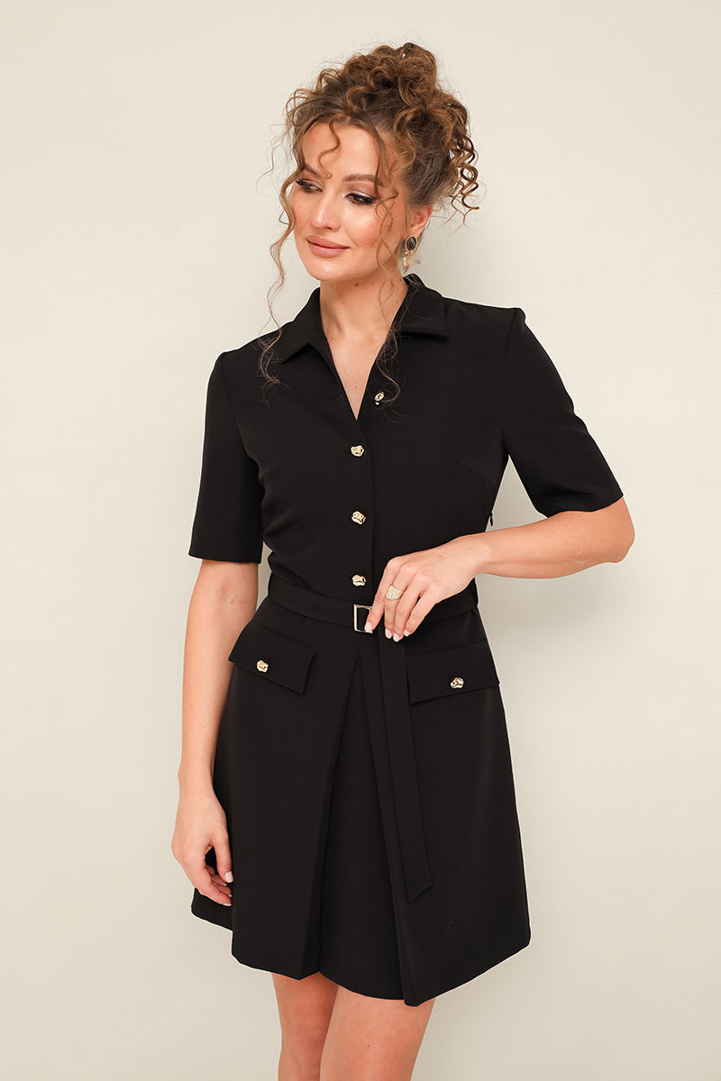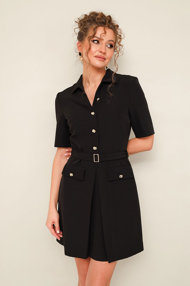 Платье отрезное по линии талии, выполнено из плательной ткани. Горловина с отложным воротником. Лиф с центральной застёжкой на петли и пуговицы. Втачные короткие рукава. Юбка А-образного силуэта, с центральной встречной складкой и с накладными клапанами с пуговицами. В комплекте съемный пояс с пряжкой. По талиии предусмотрены шлевки.