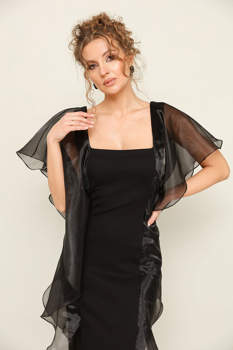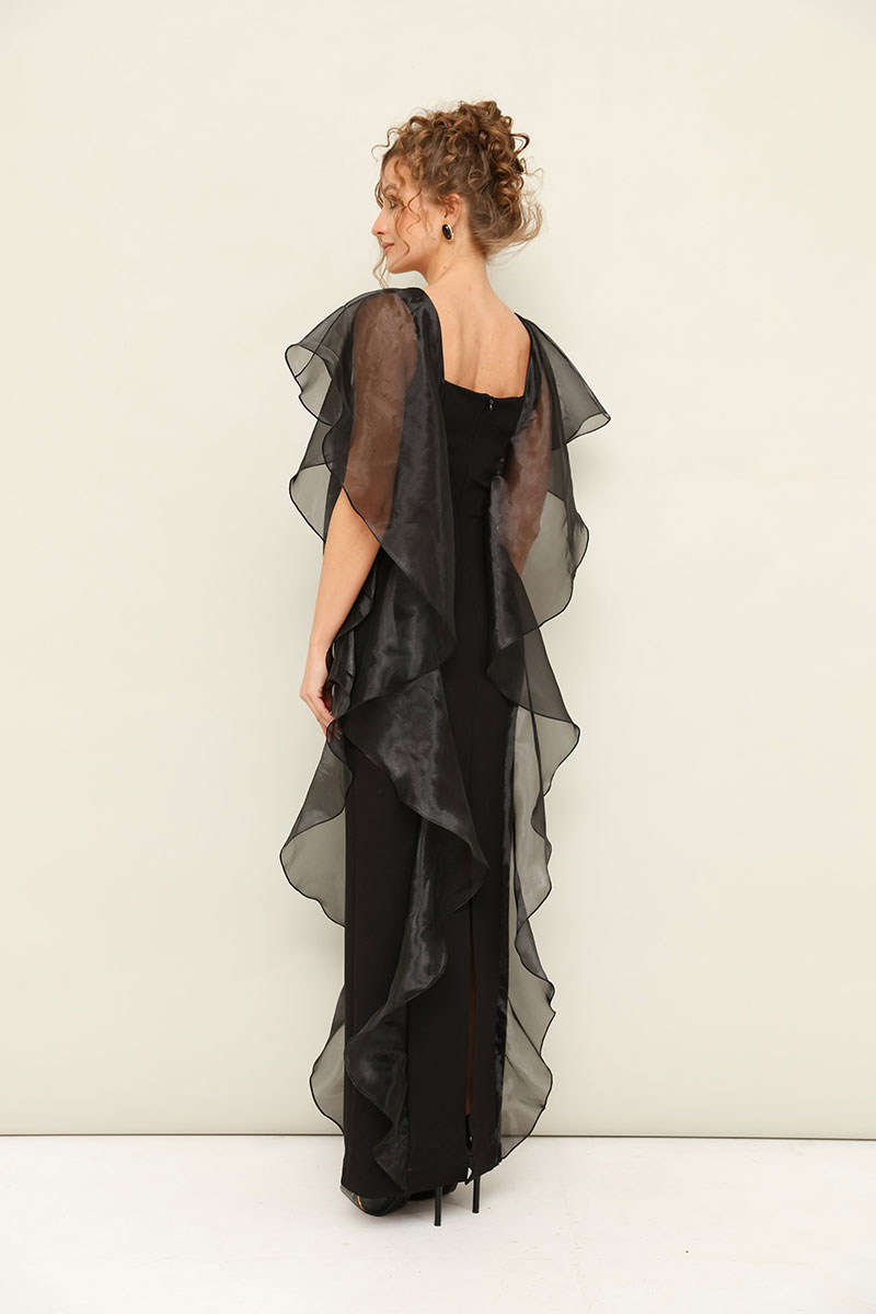 Вечернее платье в длине макси, прилегающего силуэта. Платье выполнено из трикотажного полотна и органзы. Горловина с вырезом «каре». Перед и спинка с рельефами, которые декорированы воланами из органзы. Застёжка на потайную молнию в среднем шве спинки, переходящая в шлицу.