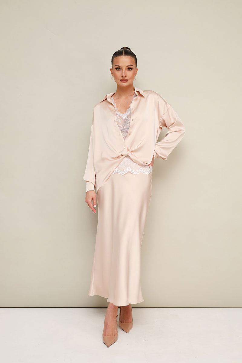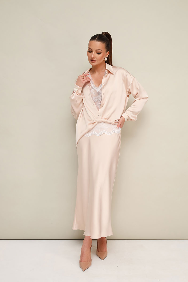 Элегантная блузка прямого кроя, выполнена из струящейся ткани с благородным матовым блеском. Горловина с рубашечным воротником на отрезной стойке, центральная застежка на петли и