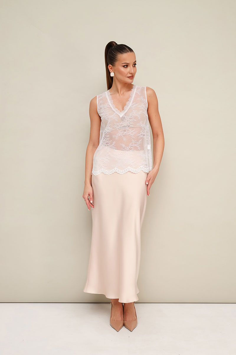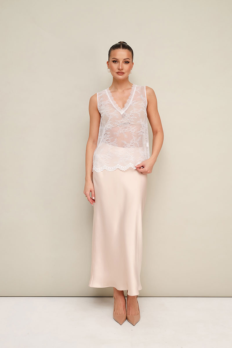 Топ прямого силуэта, выполнен из изысканного французского кружева. V-образный вырез горловины обработан кружевной отделкой.
