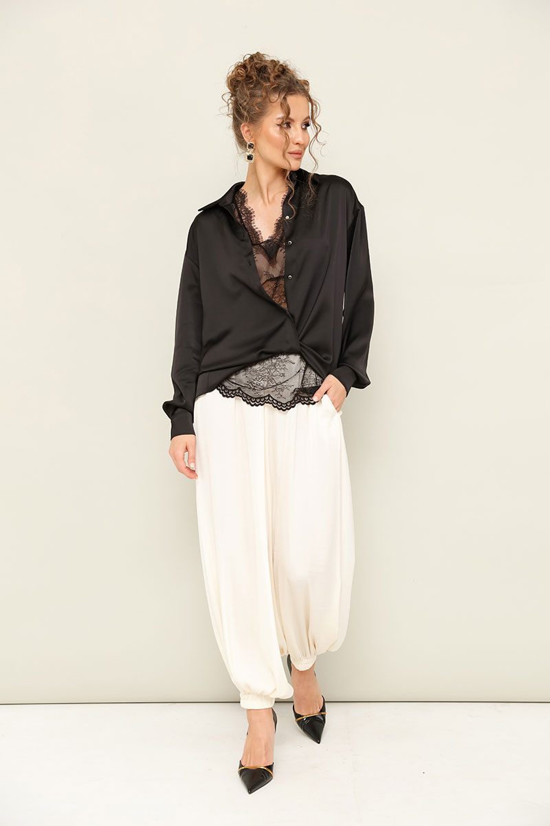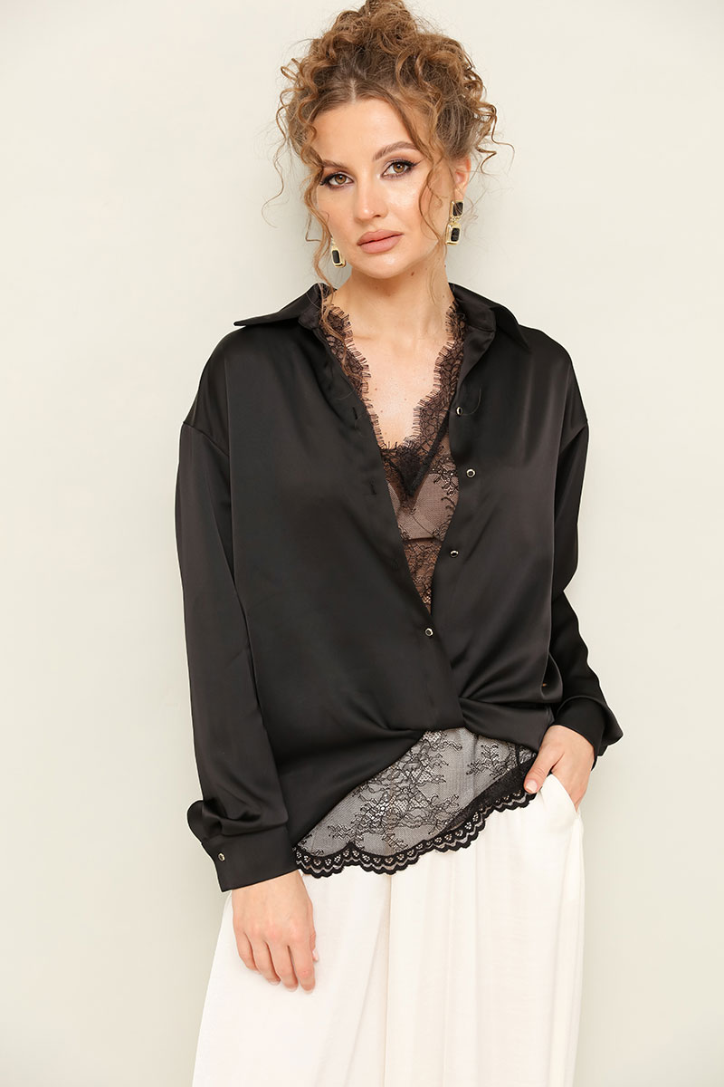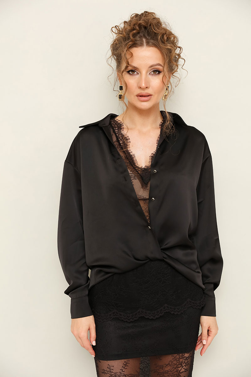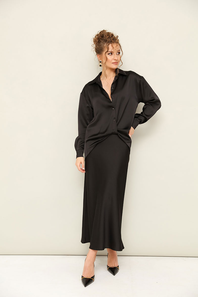 Элегантная блузка прямого кроя, выполнена из струящейся ткани с благородным матовым блеском. Горловина с рубашечным воротником на отрезной стойке, центральная застежка на петли и
