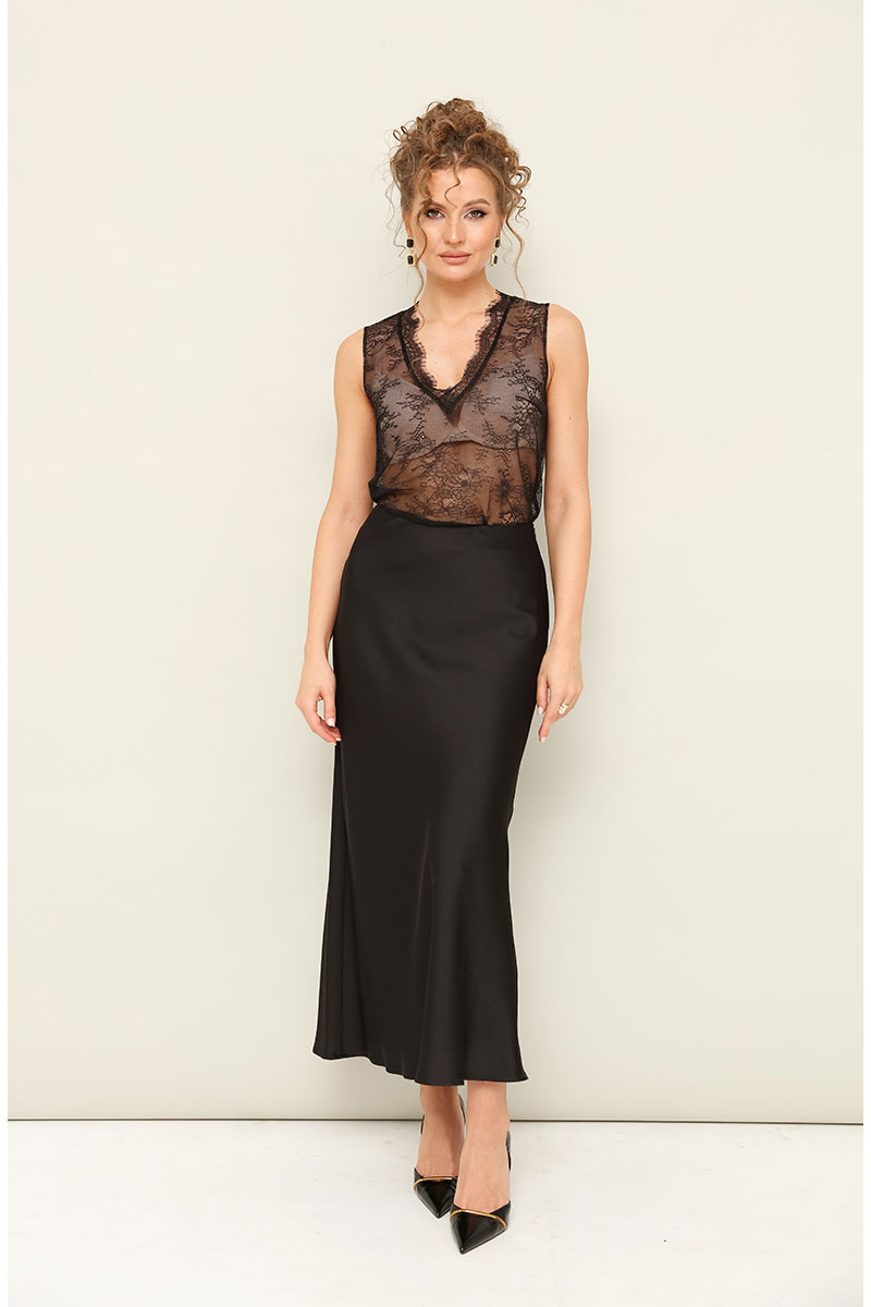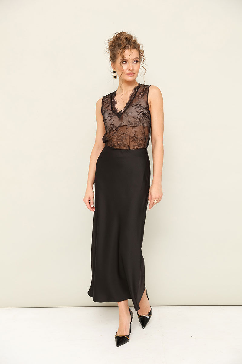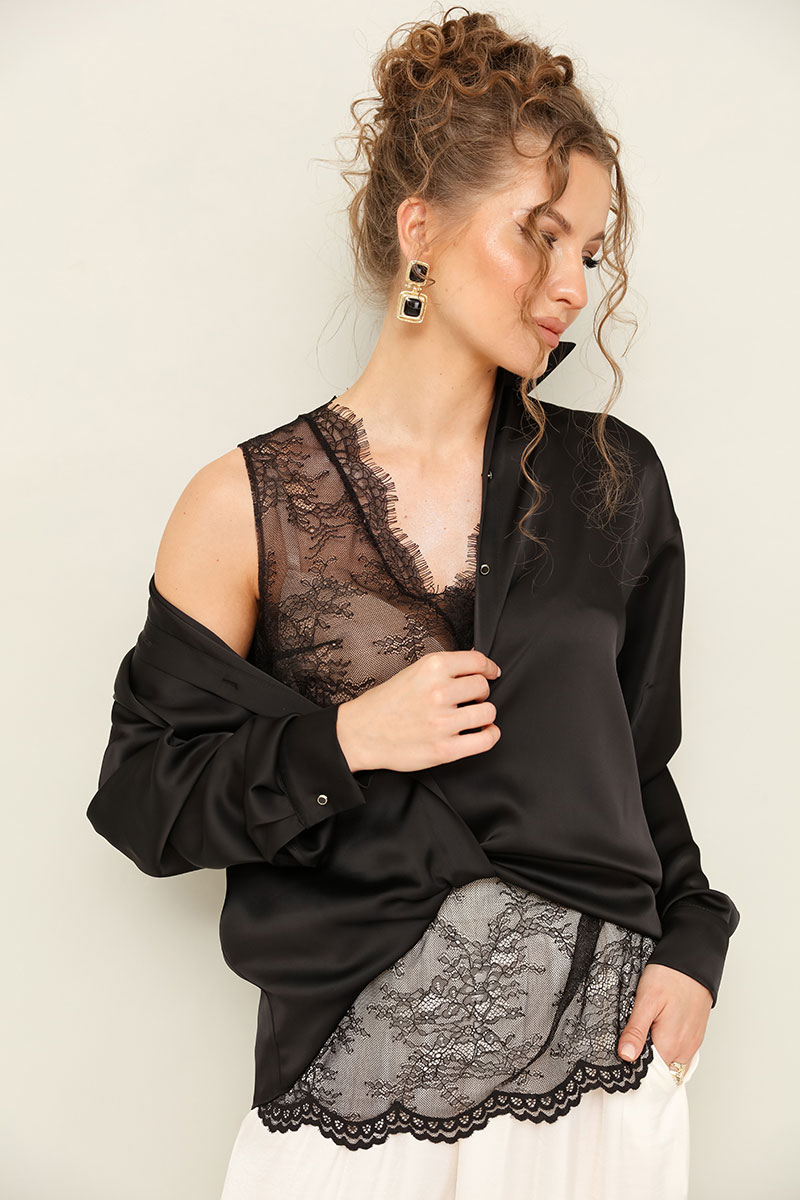 Топ прямого силуэта, выполнен из изысканного французского кружева. V-образный вырез горловины обработан кружевной отделкой.