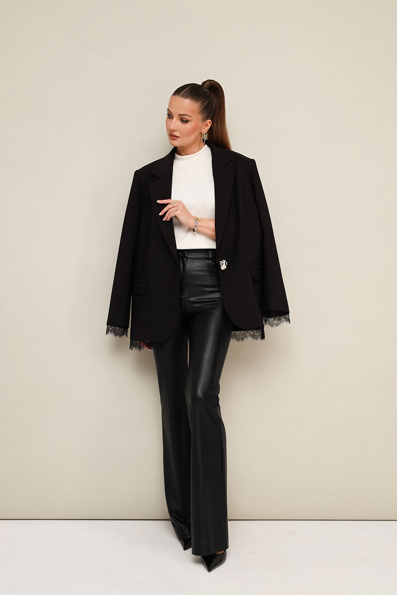 Брюки-клеш с силуэтом bootcut, выполнены из качественной экокожи на трикотажной основе. Пояс притачной с застежкой на пуговицу и тесьму-молнию, по спинке обработана резинка для комфорта и регуляции размера. На поясе предусмотрены шлевки для ремня.