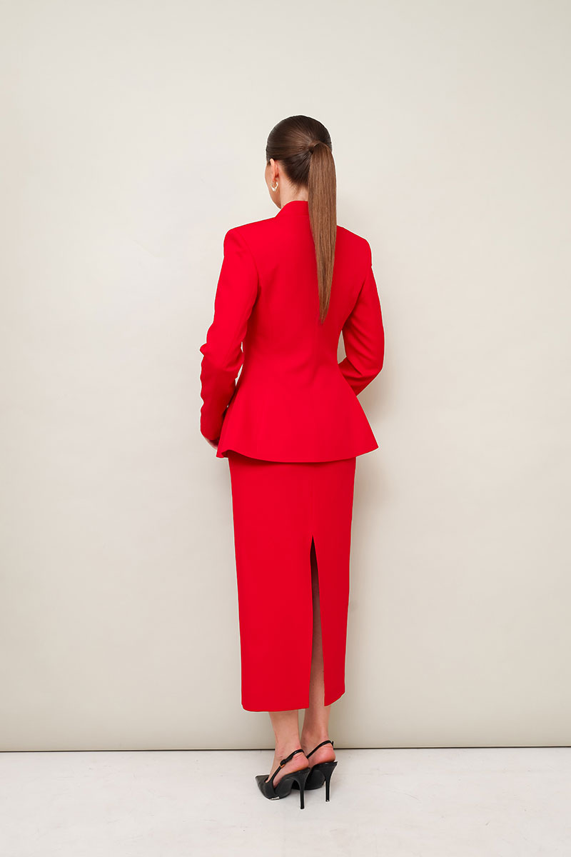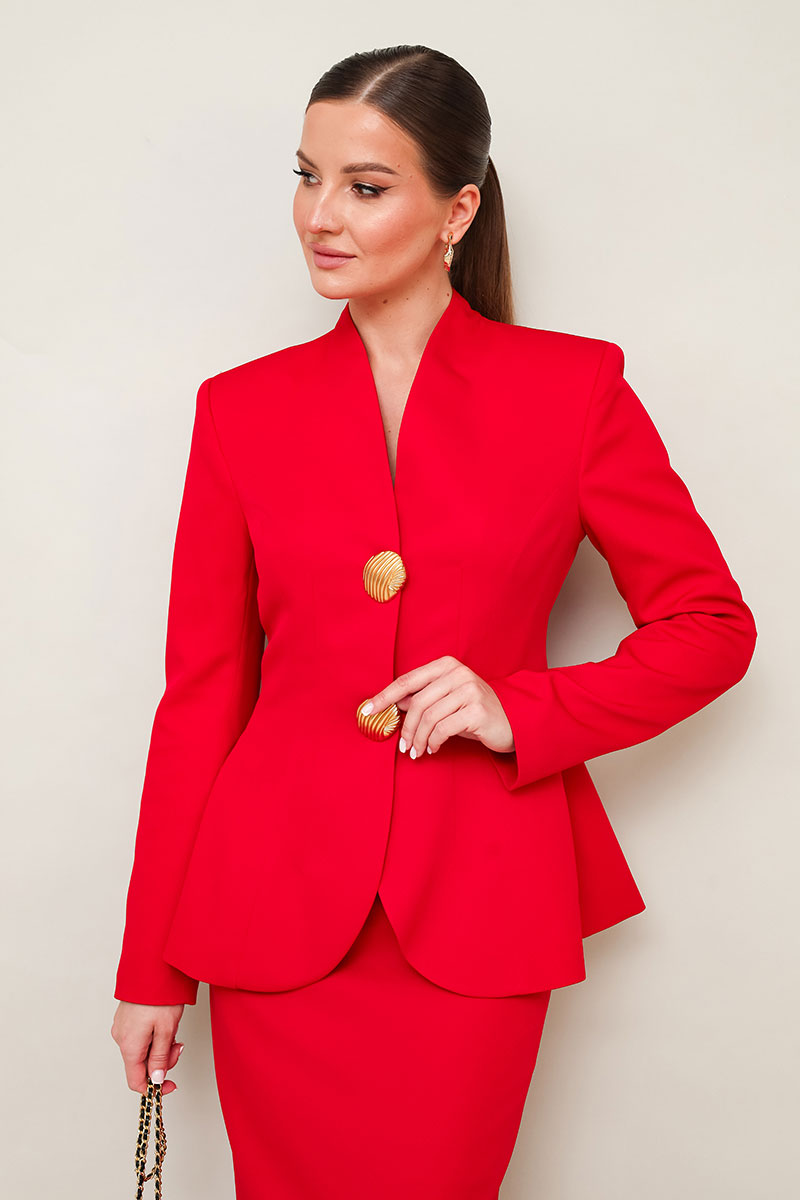 Жакет прилегающего силуэта, слегка расширенный к низу. Горловина с цельнокроеной стойкой и V-образным вырезом. Центральная застёжка на потайные пришивные кнопки с декоративными