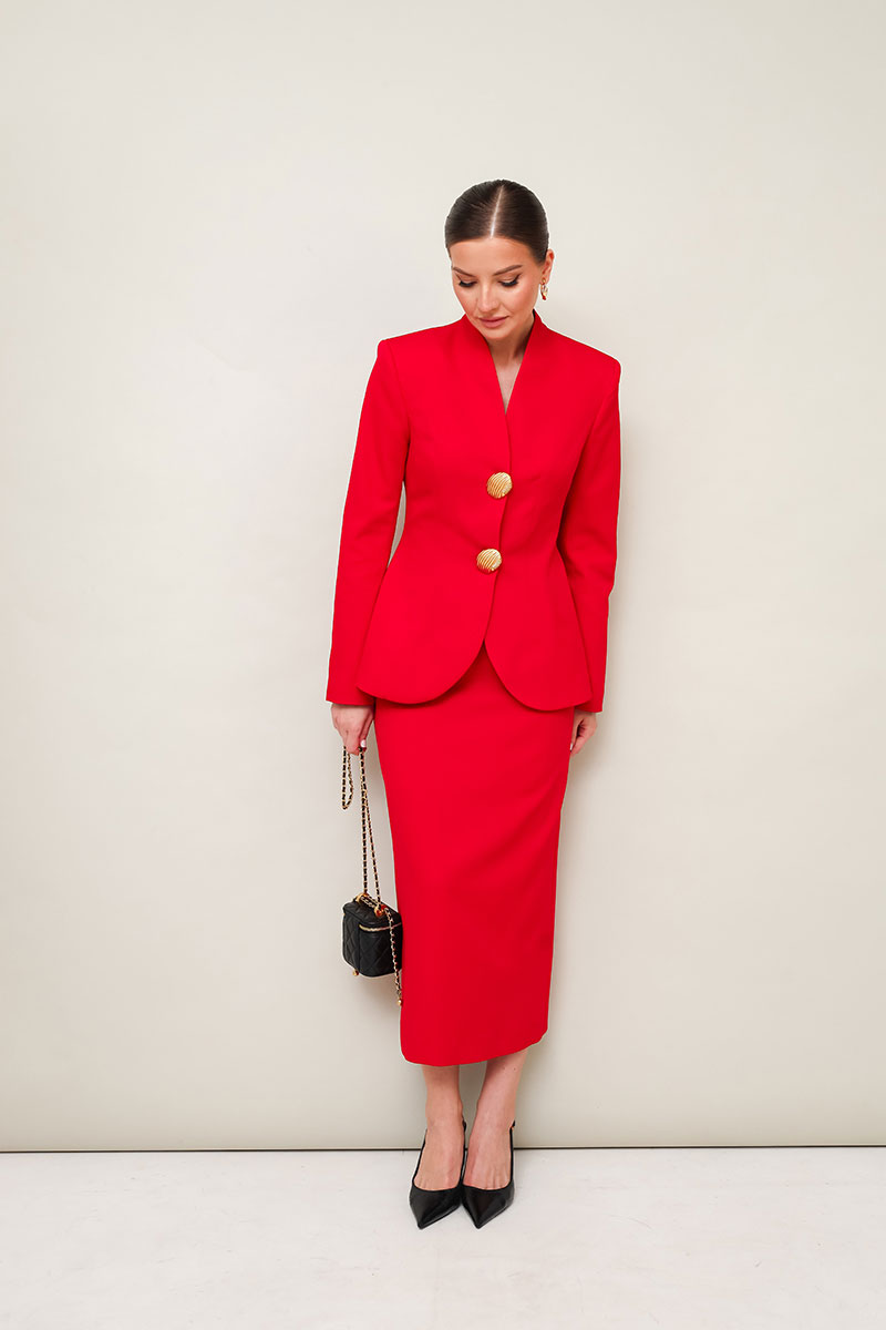 Стильный 2-х предметный комплект, состоящий из жакета и юбки, выполненный из костюмной ткани.