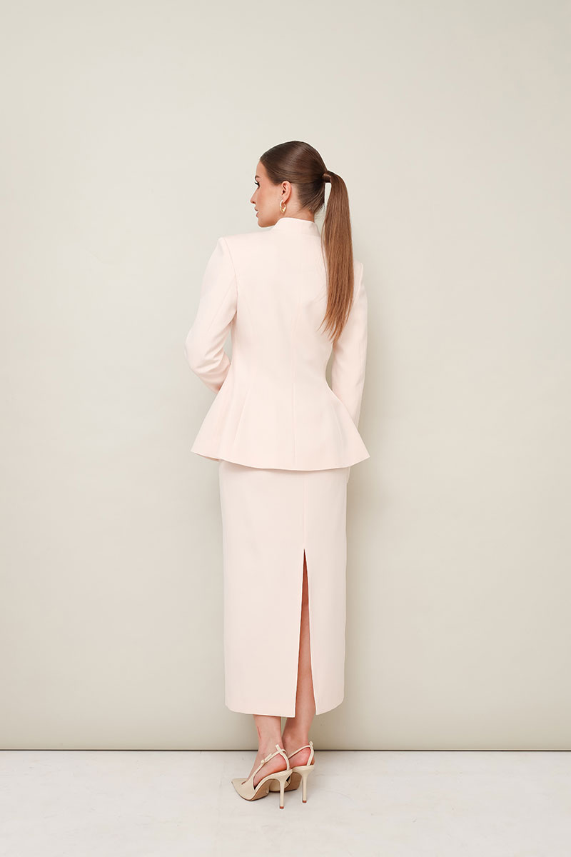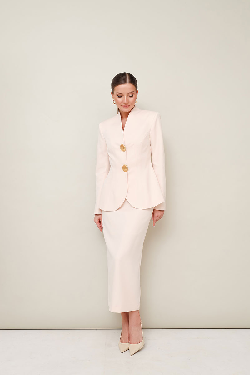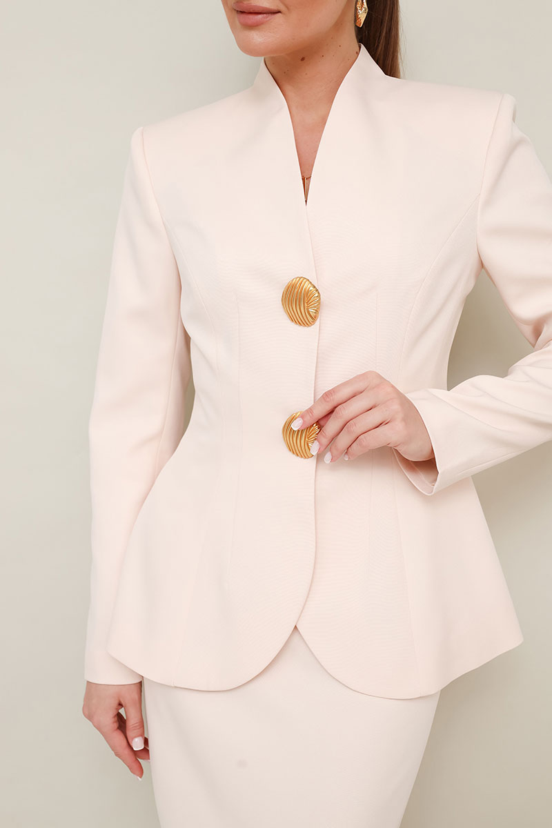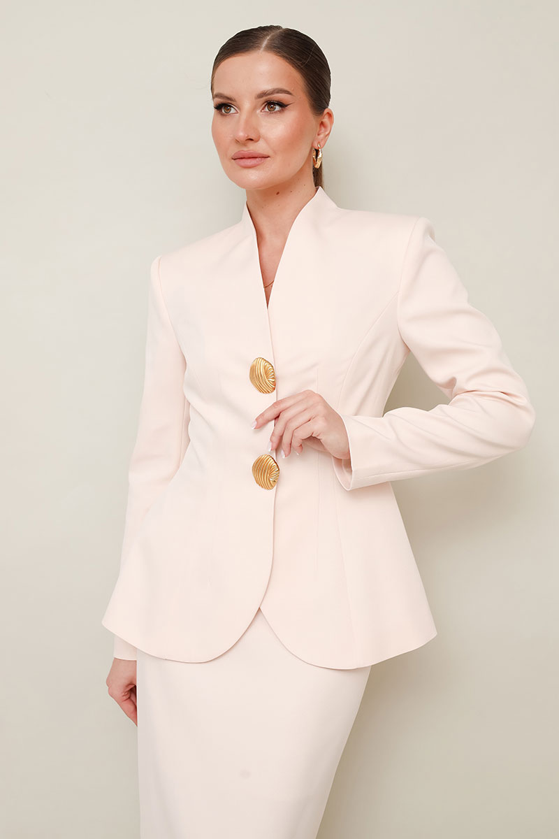Жакет прилегающего силуэта, слегка расширенный к низу. Горловина с цельнокроеной стойкой и V-образным вырезом. Центральная застёжка на потайные пришивные кнопки с декоративными