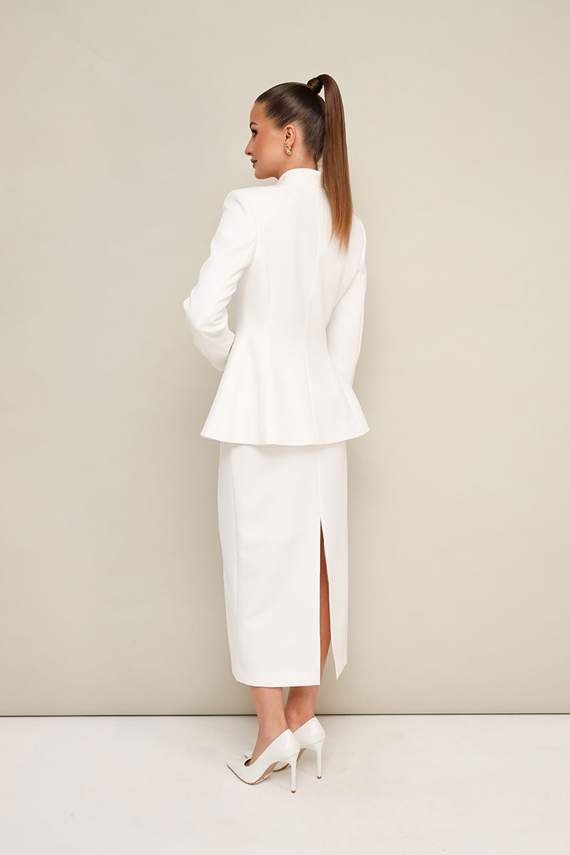 Стильный 2-предметный комплект, состоящий из жакета и юбки, выполненный из костюмной ткани.