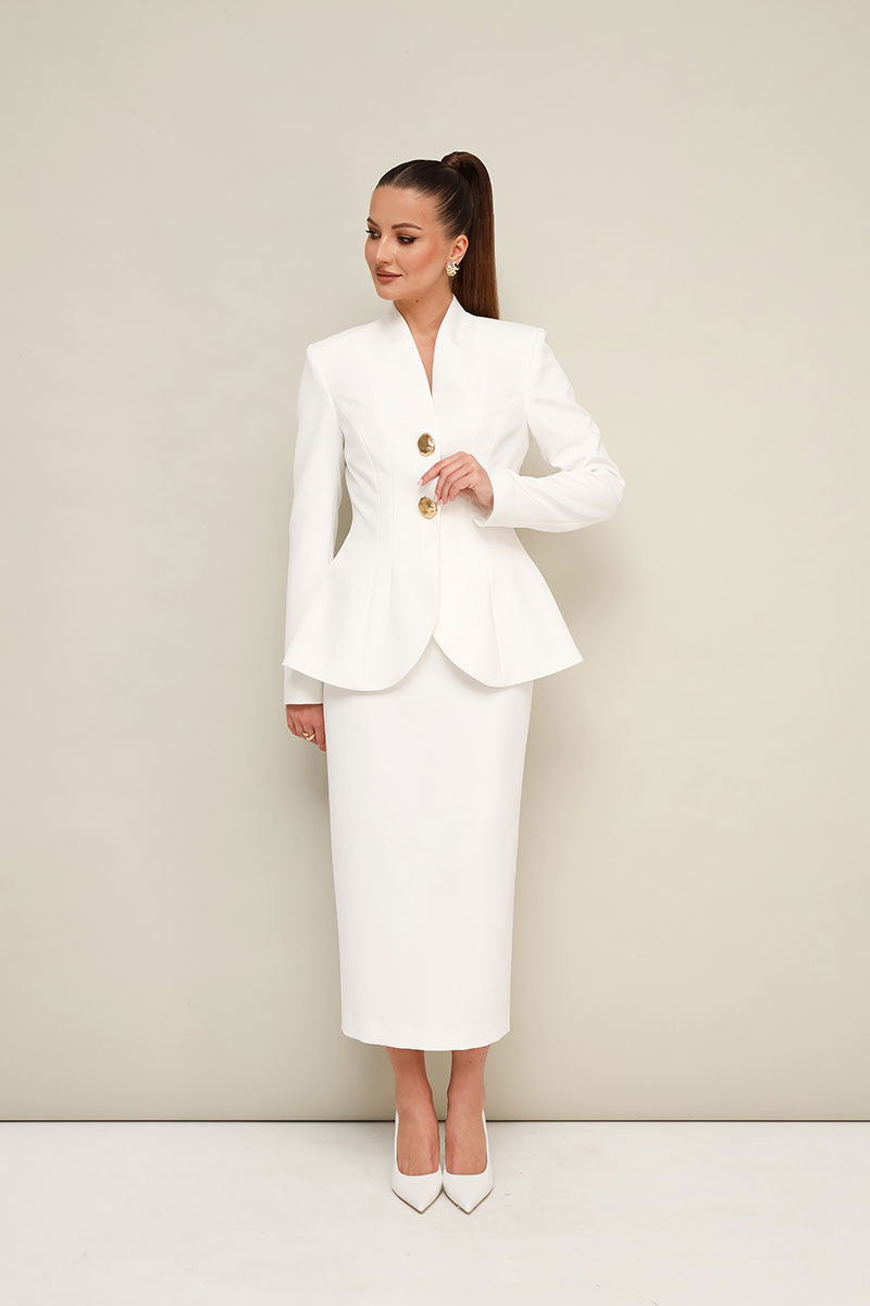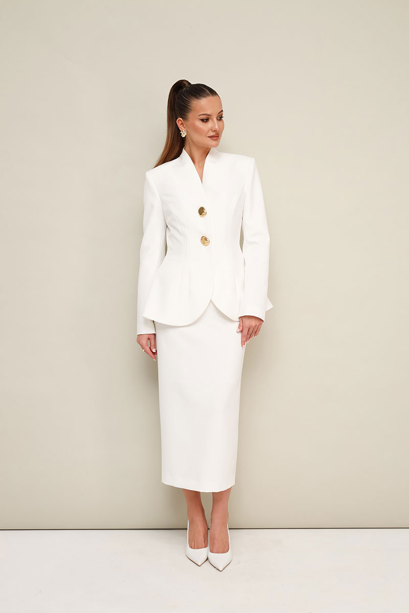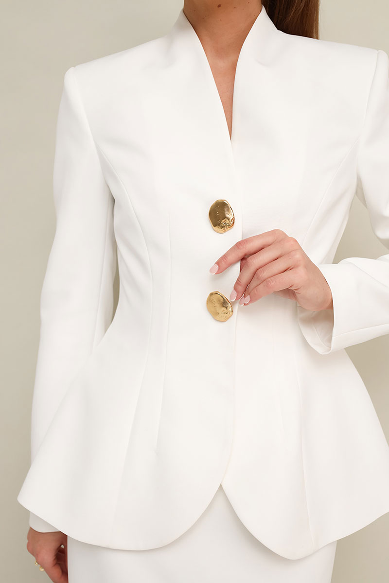 Жакет прилегающего силуэта, слегка расширенный к низу. Горловина с цельнокроеной стойкой и V-образным вырезом. Центральная застёжка на потайные пришивные кнопки с декоративными