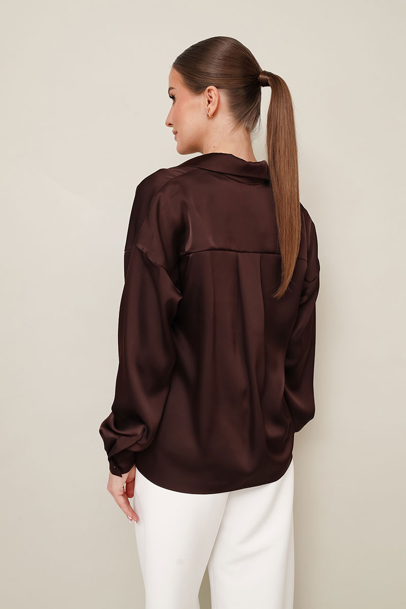Элегантная блузка прямого кроя, выполнена из струящейся ткани с благородным матовым блеском. Горловина с рубашечным воротником на отрезной стойке, центральная застежка на петли и