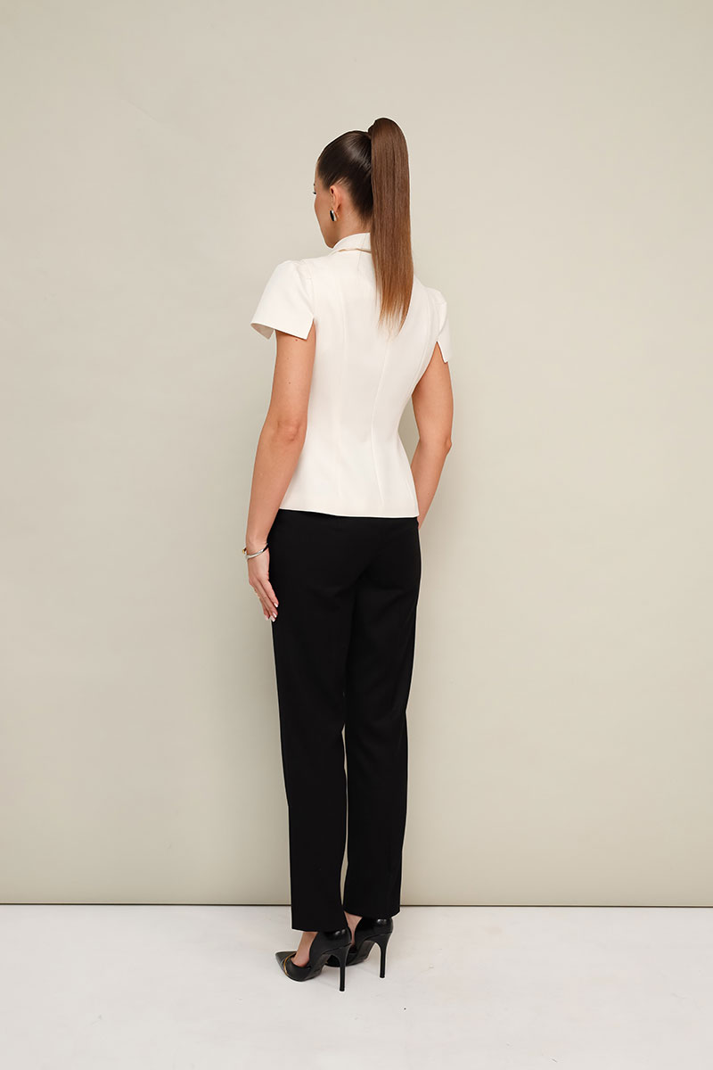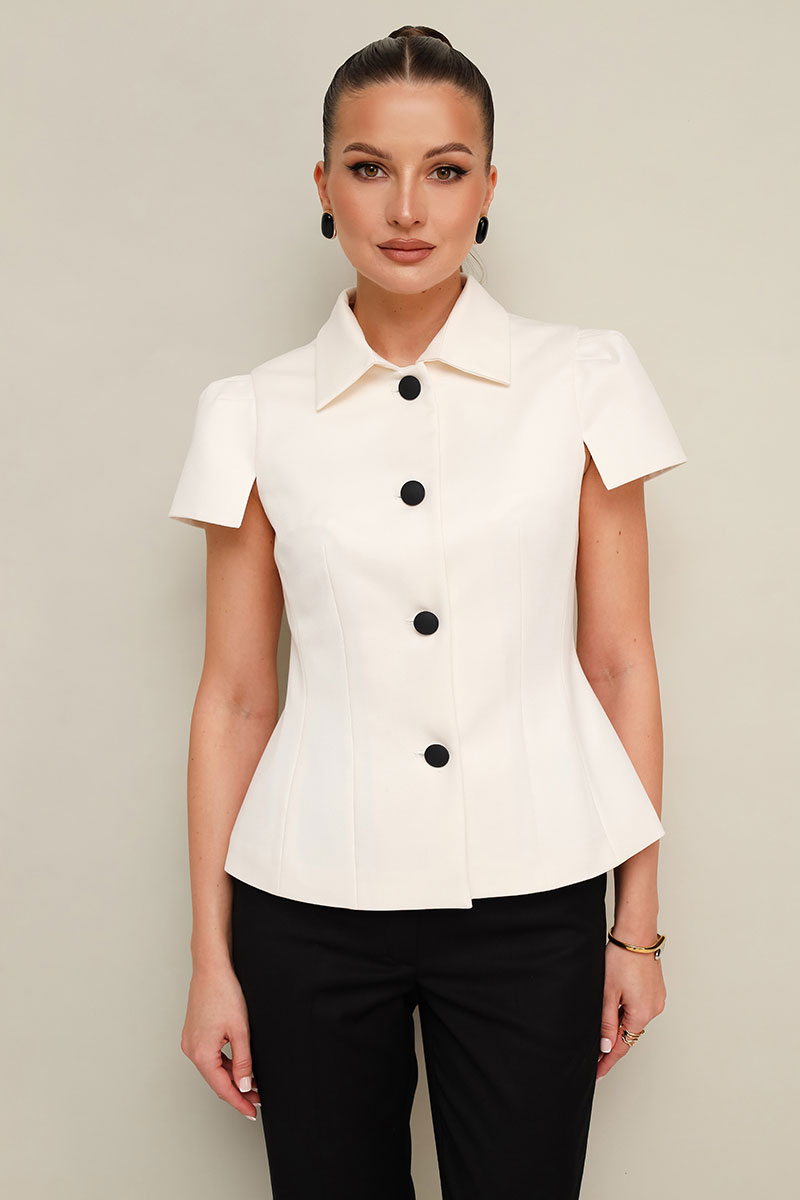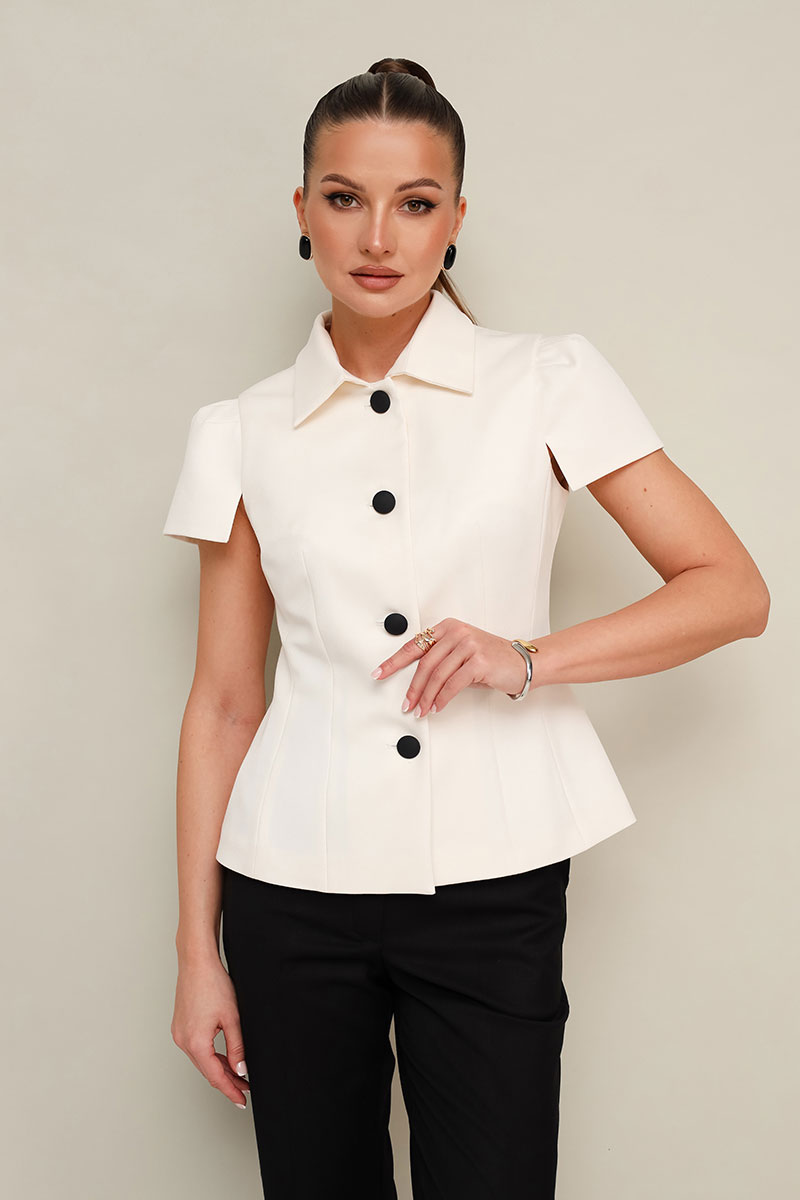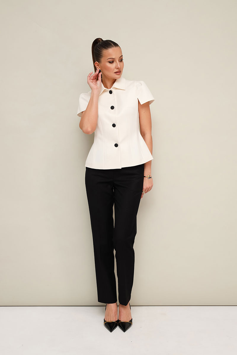 Жакет полуприлегающего силуэта, с центральной застежкой на петли и пуговицы. Отложной воротник со стойкой. Рукава короткие с вытачками по окату и разрезами по низу. Жакет на