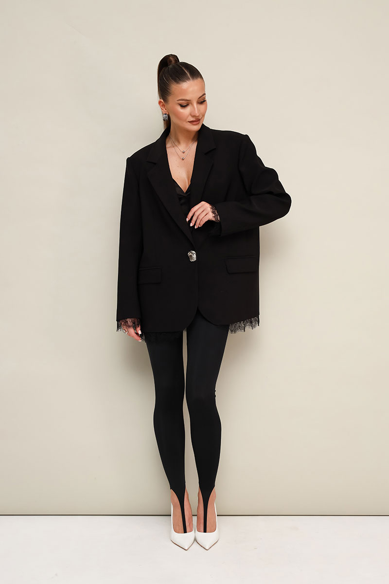 Жакет актуального прямого кроя, выполнен из костюмной ткани. Воротник пиджачного типа с отложными лацканами, край борта скругленный по низу жакета. Спереди обработаны прорезные карманы в рамку с клапанами. Рукава втачные двухшовные. Спинка со средним швом. Низ жакета и рукавов декорирован французским кружевом. Жакет обработан подкладкой.