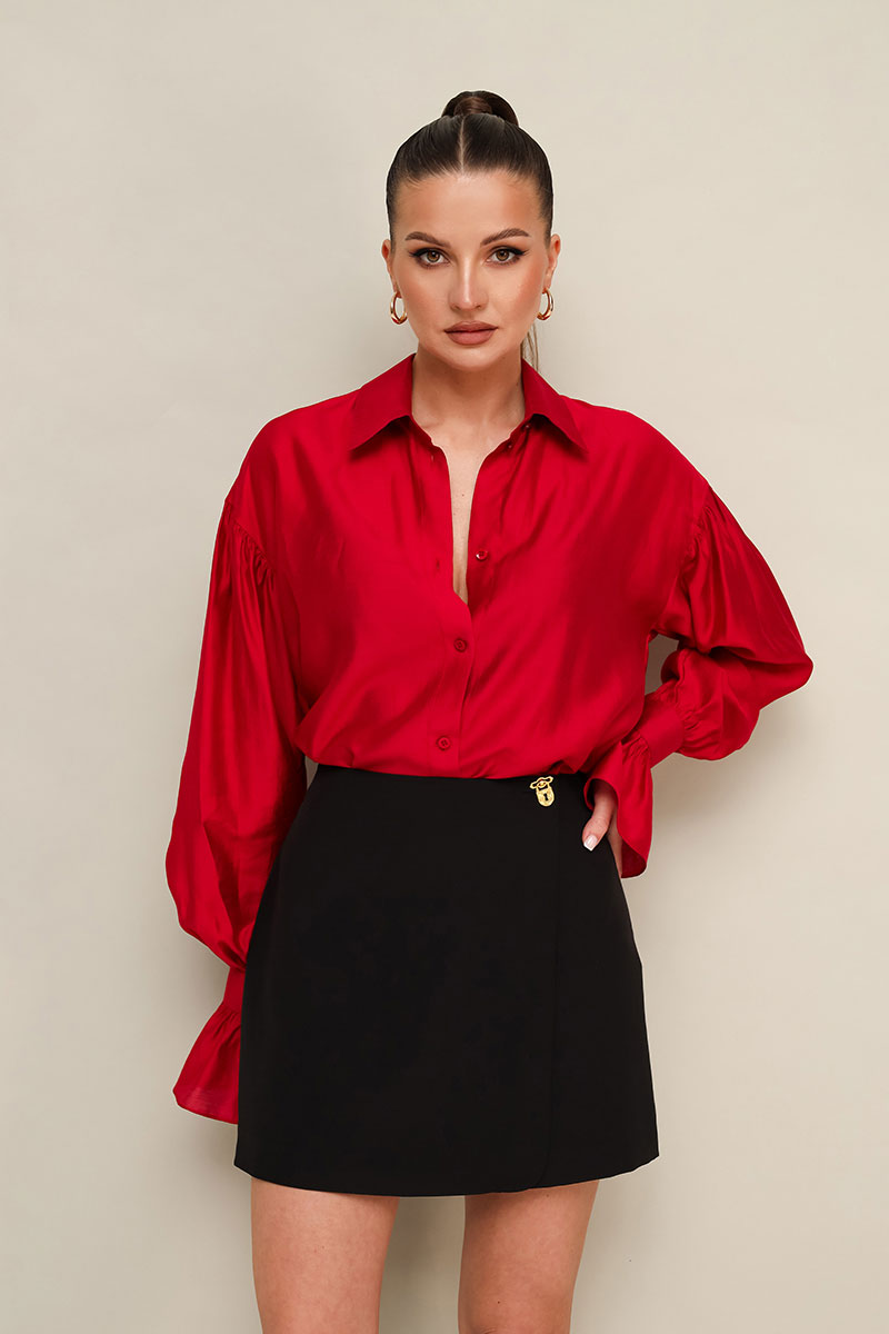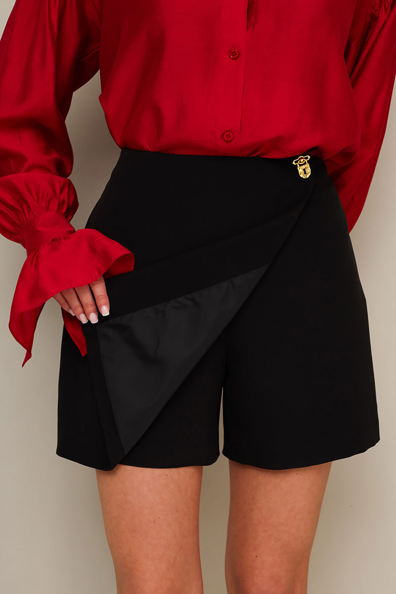 Юбка-шорты в длине мини, выполнена из костюмной ткани. Спереди имитация юбки на запах с застежкой на акцентную пуговицу. Основная застёжка в боковом шве на потайную молнию.
