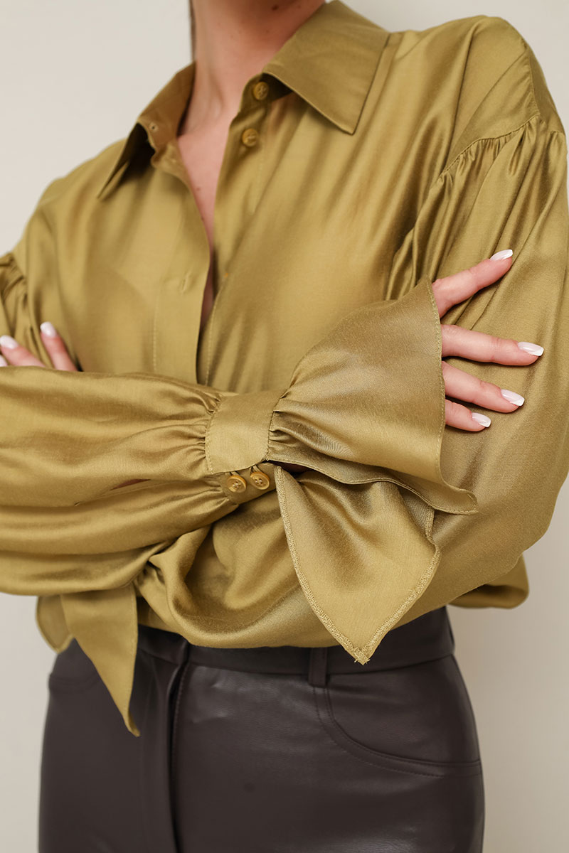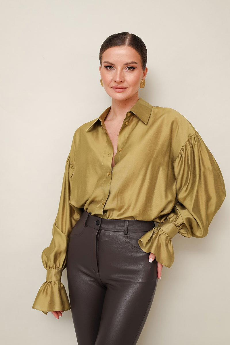 Акцентная блузка прямого кроя, выполнена из натуральной невесомой ткани с матовым блеском. Горловина с рубашечным воротником на отрезной стойке, центральная застежка на петли и пуговицы. Рукава со спущенной линией втачивания плеча, манжеты с рюшей с застежкой на навесные петли и пуговицы.