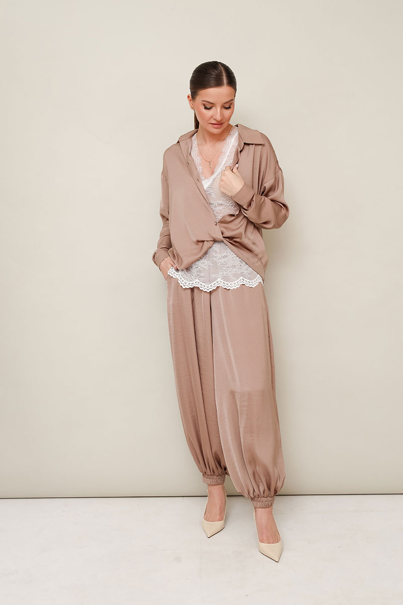 Комфортные брюки-алладины свободного силуэта с боковыми наклонными карманами. Притачной пояс и манжеты на резинке.