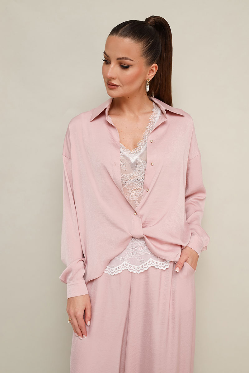 Элегантная блузка прямого кроя, выполнена из струящейся ткани с благородным матовым блеском. Горловина с рубашечным воротником на отрезной стойке, центральная застежка на петли и