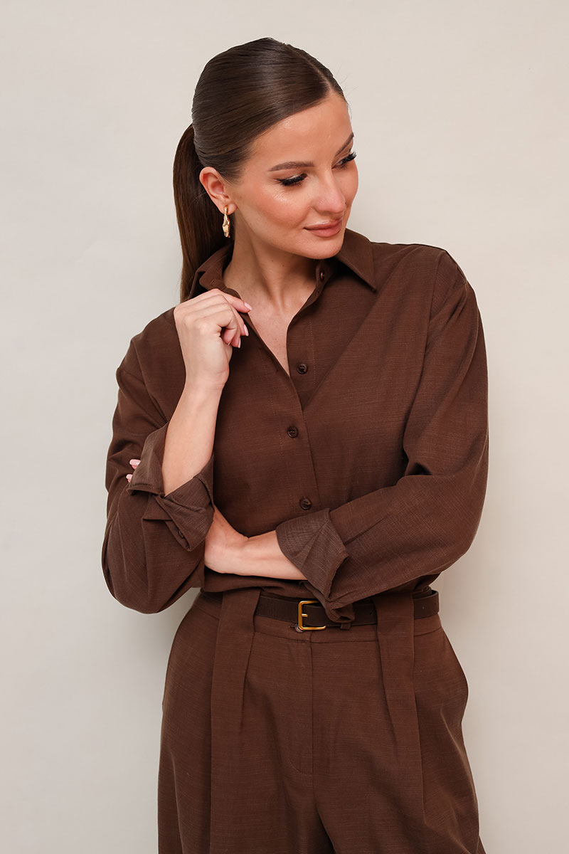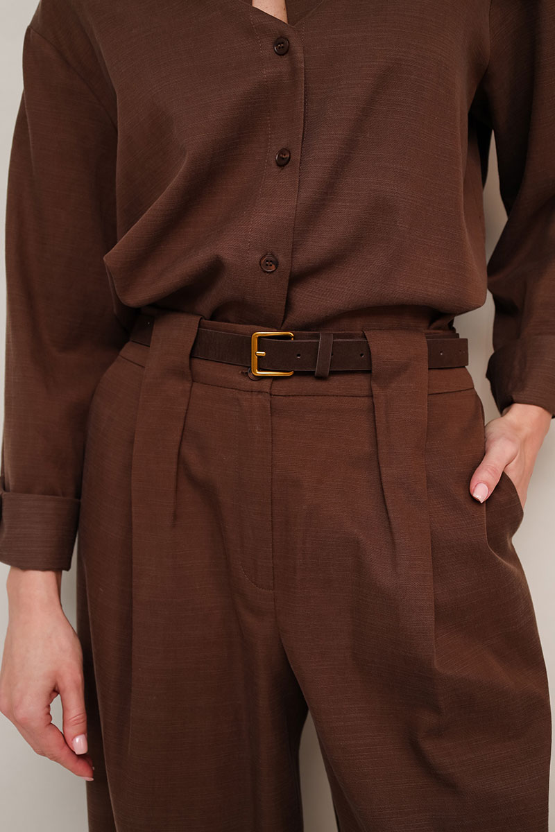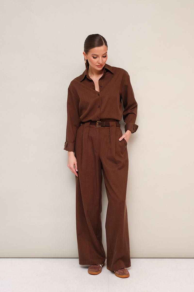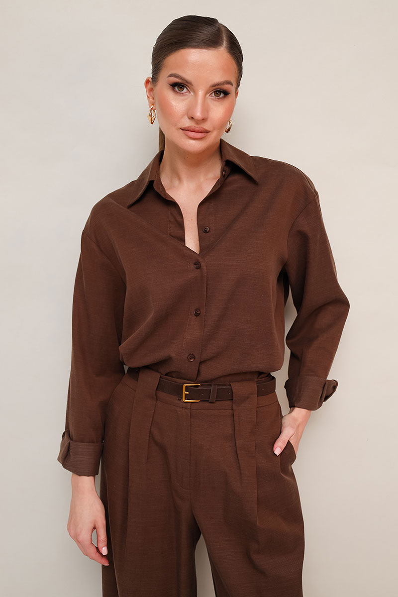 Брючный комплект из натуральной ткани с высоким содержанием вискозы в составе. Рубашка прямого кроя, горловина с рубашечным воротником на отрезной стойке, центральная застежка на
