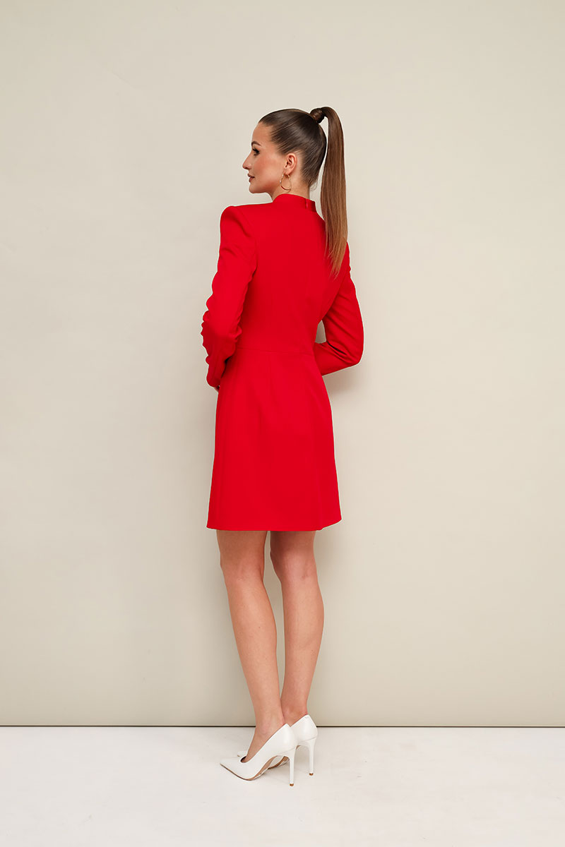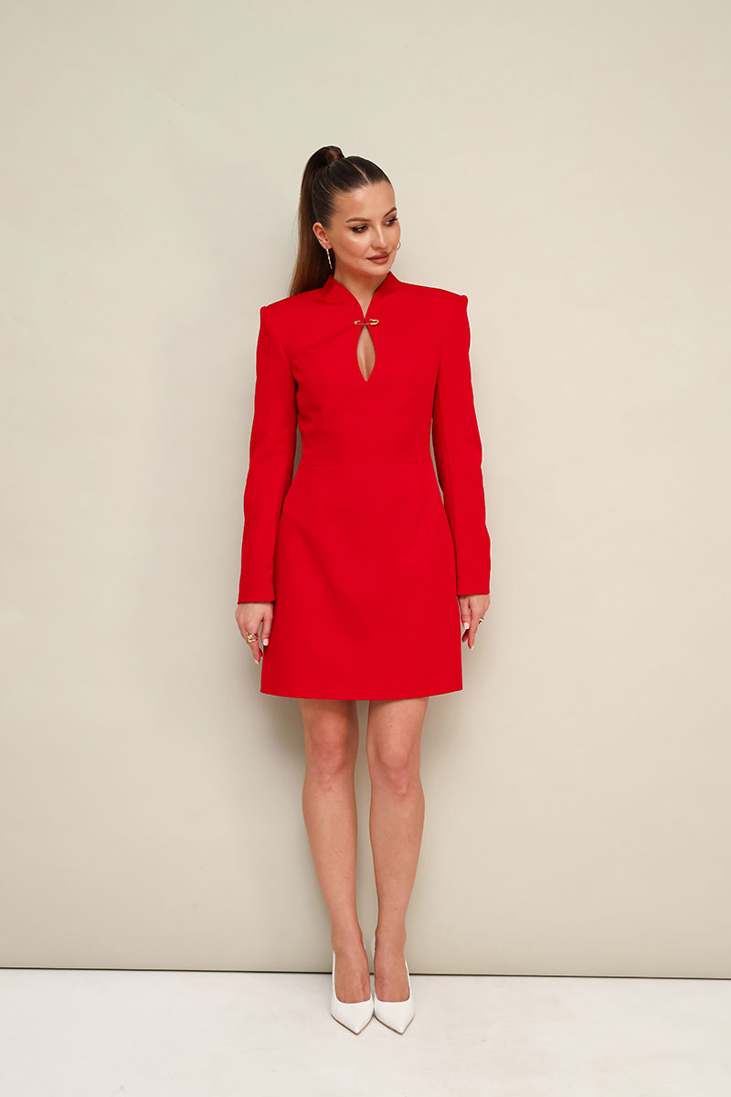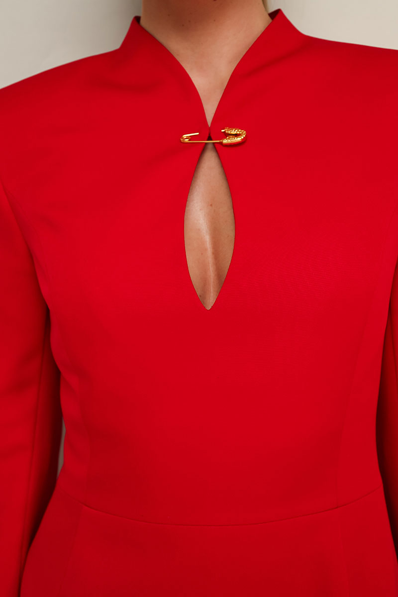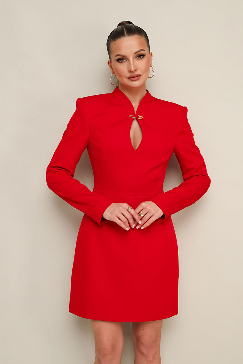 Платье в длине мини, отрезное по линии талии, выполнено из плательной ткани. Горловина с цельнокроеной стойкой и вырезом «капля» с декоративной брошью в виде английской булавки. Лиф переда с рельефами. Длинные друхшовные рукава. Юбка А-образного силуэта. В среднем шве спинки застежка на потайную молнию.
