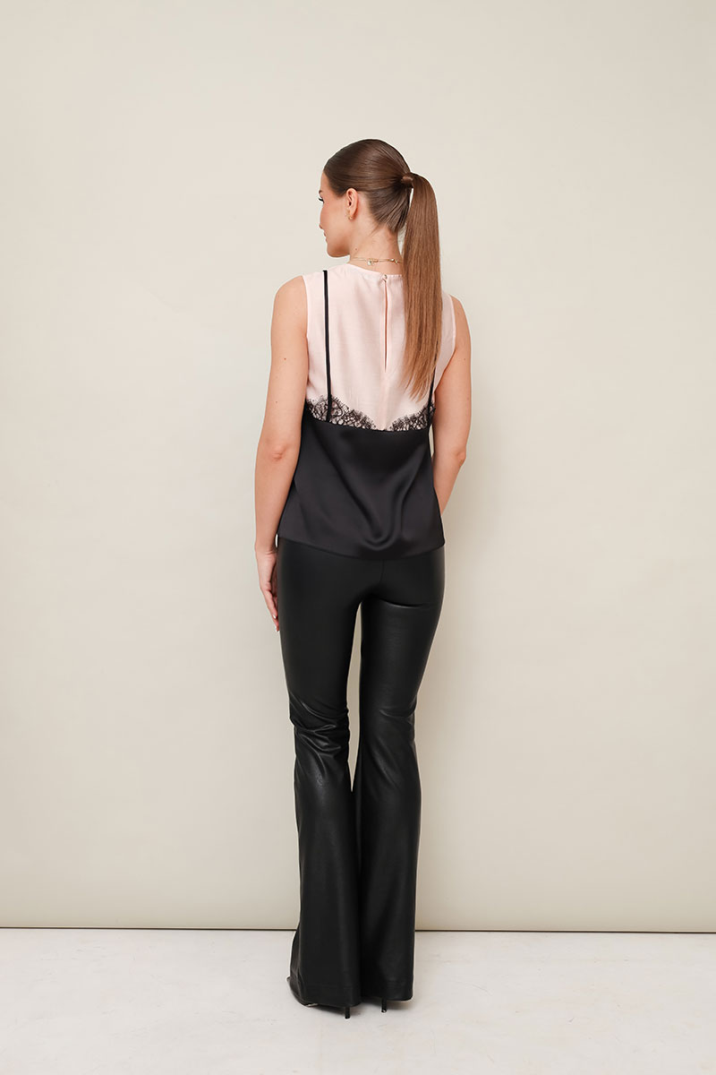 Элегантная блузка прямого силуэта в бельевом стиле. Блузка с округлым вырезом горловины, спереди выполнена имитация чашки из французского кружева на бретельках. Спинка с застёжкой в разрезе на навесную петлю и пуговицу. Блузка создает основу для вечерних и повседневных образов в вашем гардеробе.