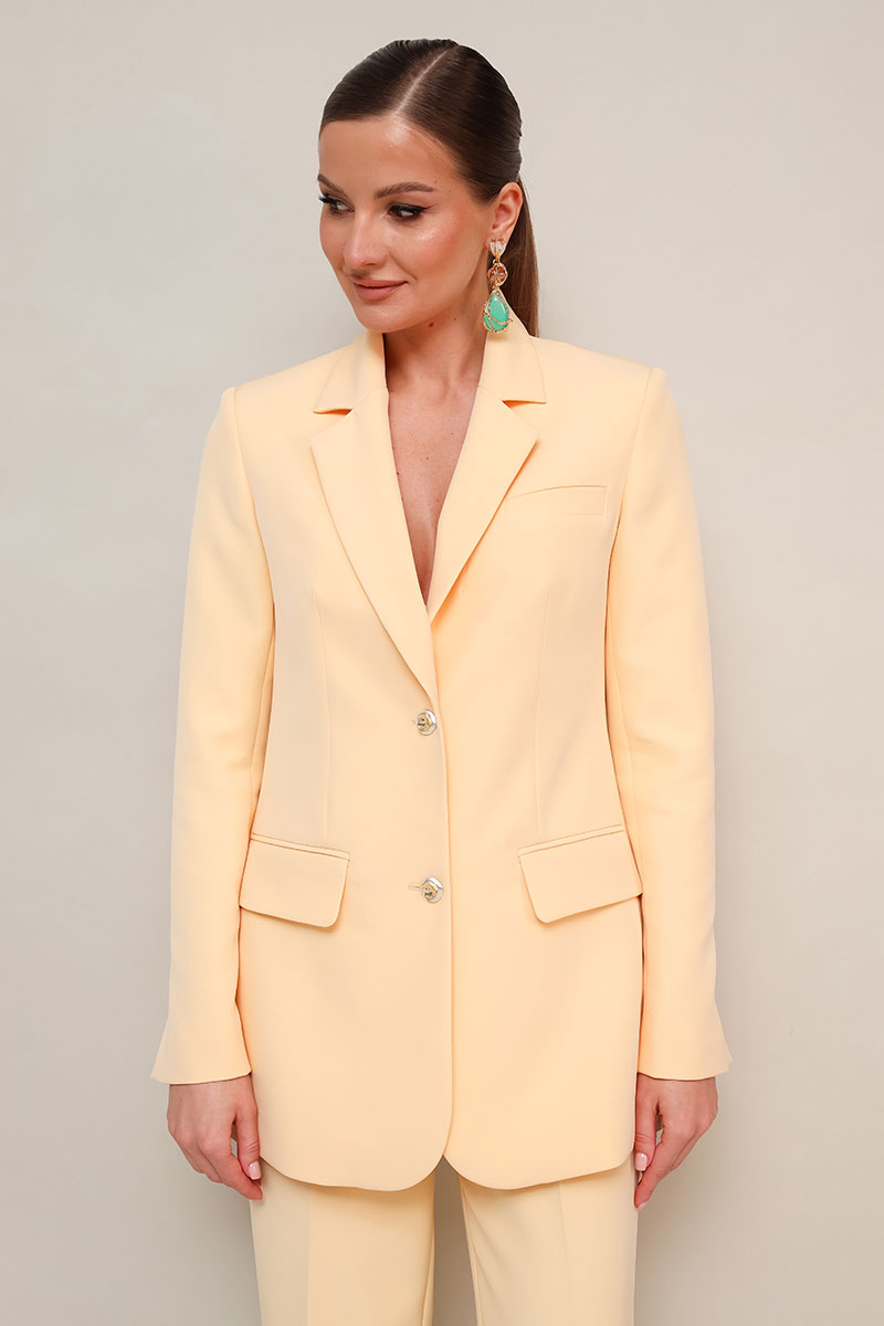 Жакет полуприлегающего силуэта, с центральной застежкой на петли и пуговицы. Воротник пиджачного типа с отложными лацканами, край борта скругленный по низу жакета. Спереди обработаны