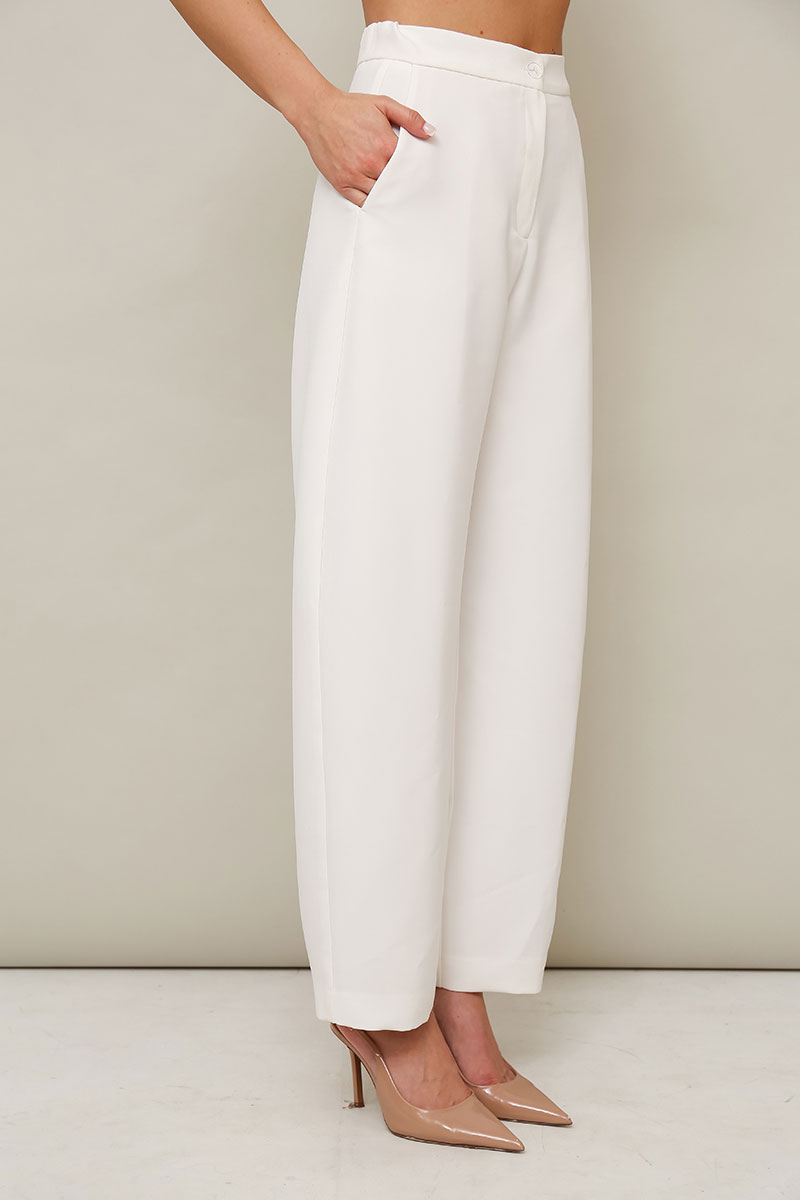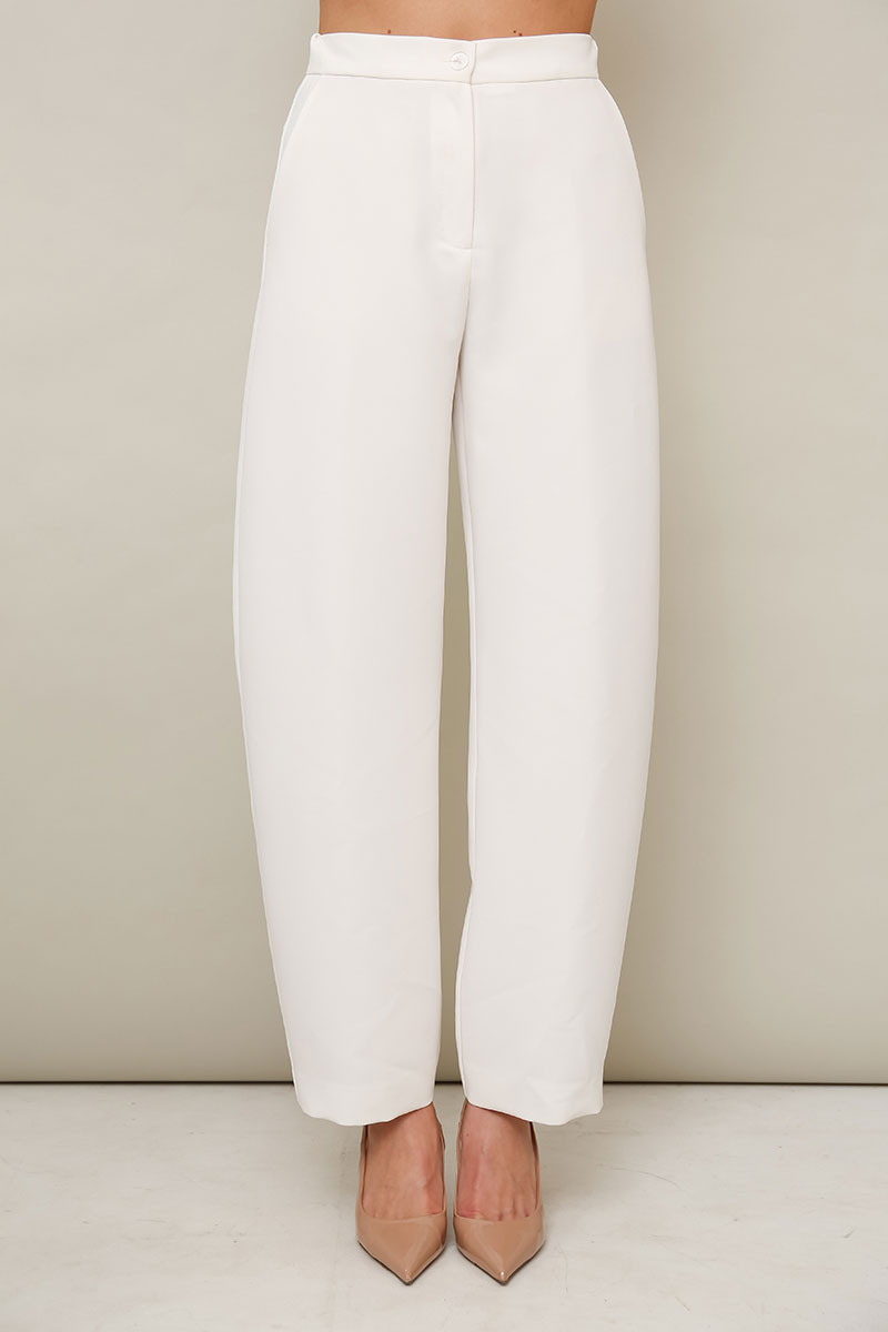 Брюки «barrel» с актуальным, характерным изогнутым силуэтом, они расширяются в области коленей и