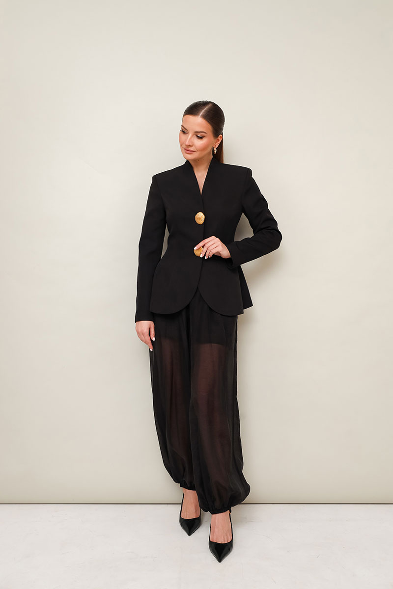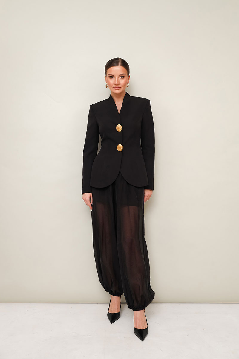 Жакет прилегающего силуэта, слегка расширенный к низу. Горловина с цельнокроеной стойкой и V-образным вырезом. Центральная застёжка на потайные пришивные кнопки с декоративными акцентными пуговицами. Рукава втачные, двухшовные. Спинка с рельефами и средним швом.