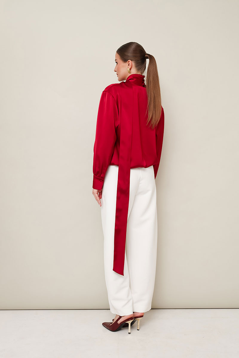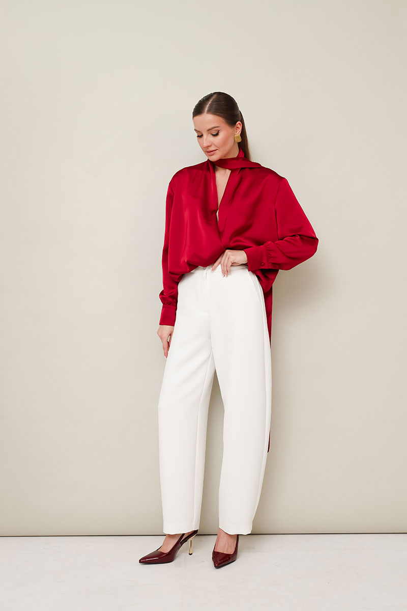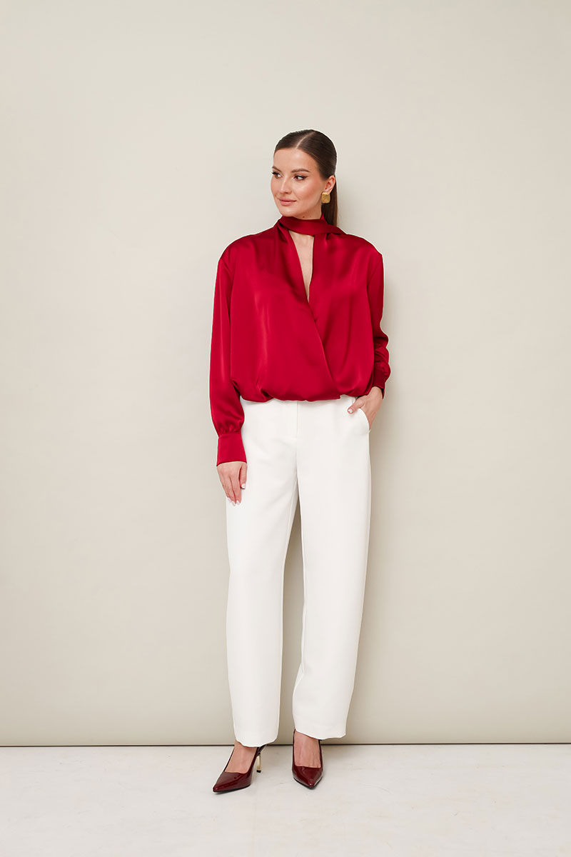Акцентная блузка прямого кроя, выполнена из струящейся ткани с благородным матовым блеском. Горловина с V-образным вырезом на запах. Рукава со спущенной линией втачивания плеча,