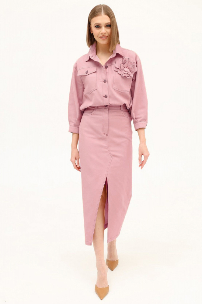 Стильный комплект, состоящий из жакета и юбки из джинсовой ткани.