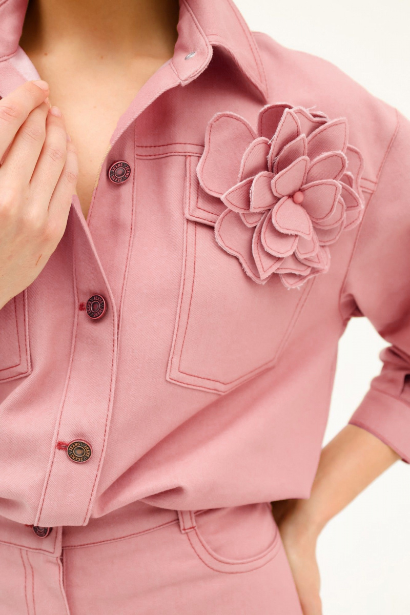 Жакет свободного силуэта с центральной застежкой на петли- пуговицы с двумя накладными карманами с кламанами отстроченными двойными отделочными нитками. Рукав втачной двухшовный ¾ со спущенным плечевым швом. Воротник рубашечный с отрезной стойкой отстроченный отделочными нитками. Декором служит съемный цветок.