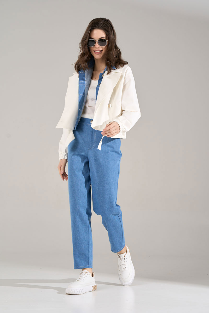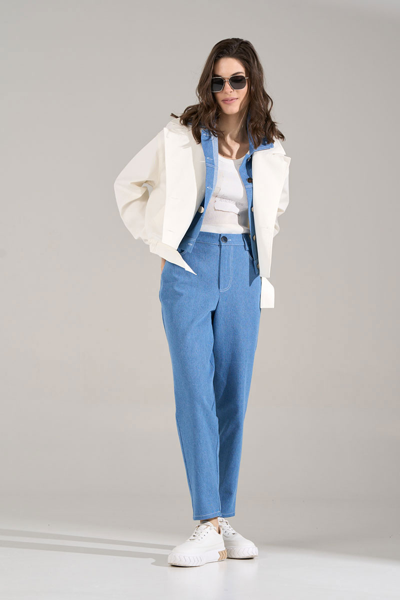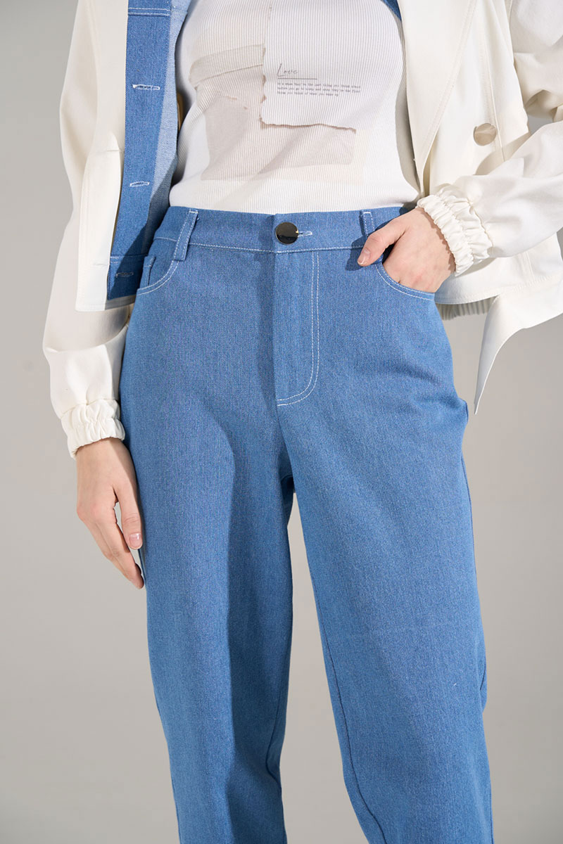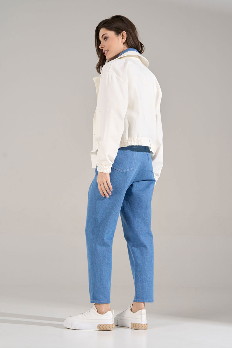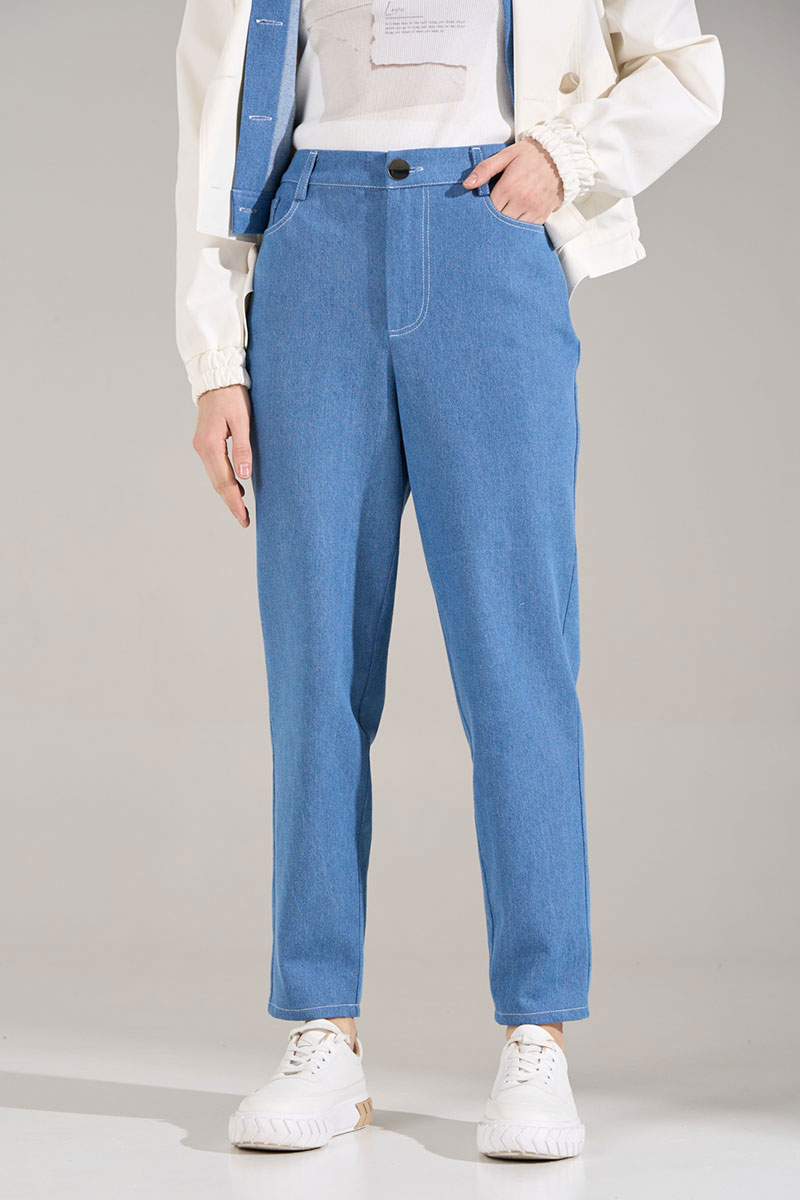 Брюки джинсовые с завышенной посадкой, свободного силуэта, слегка зауженные к низу, с отрезным поясом и накладными карманами на задних половинках.
