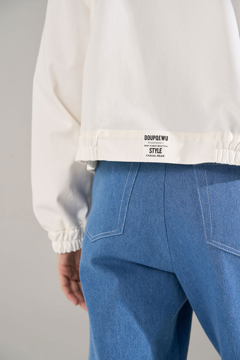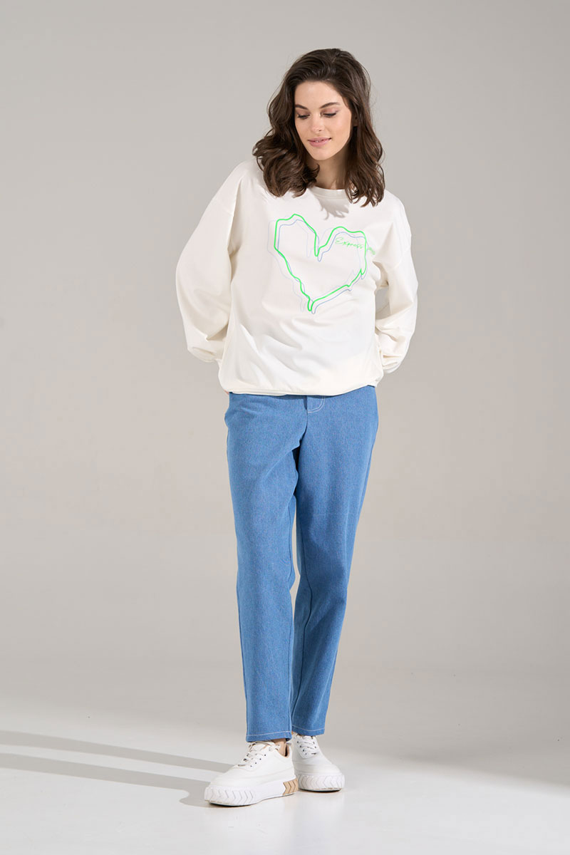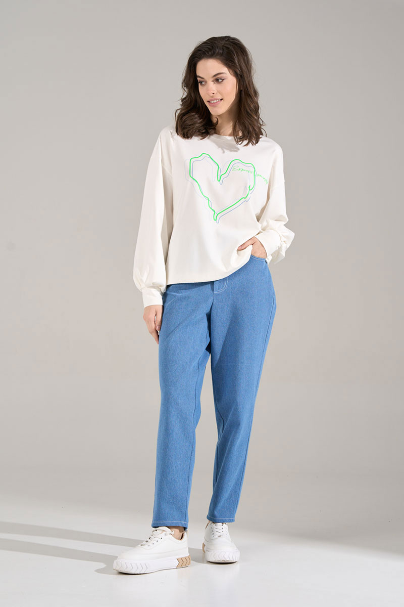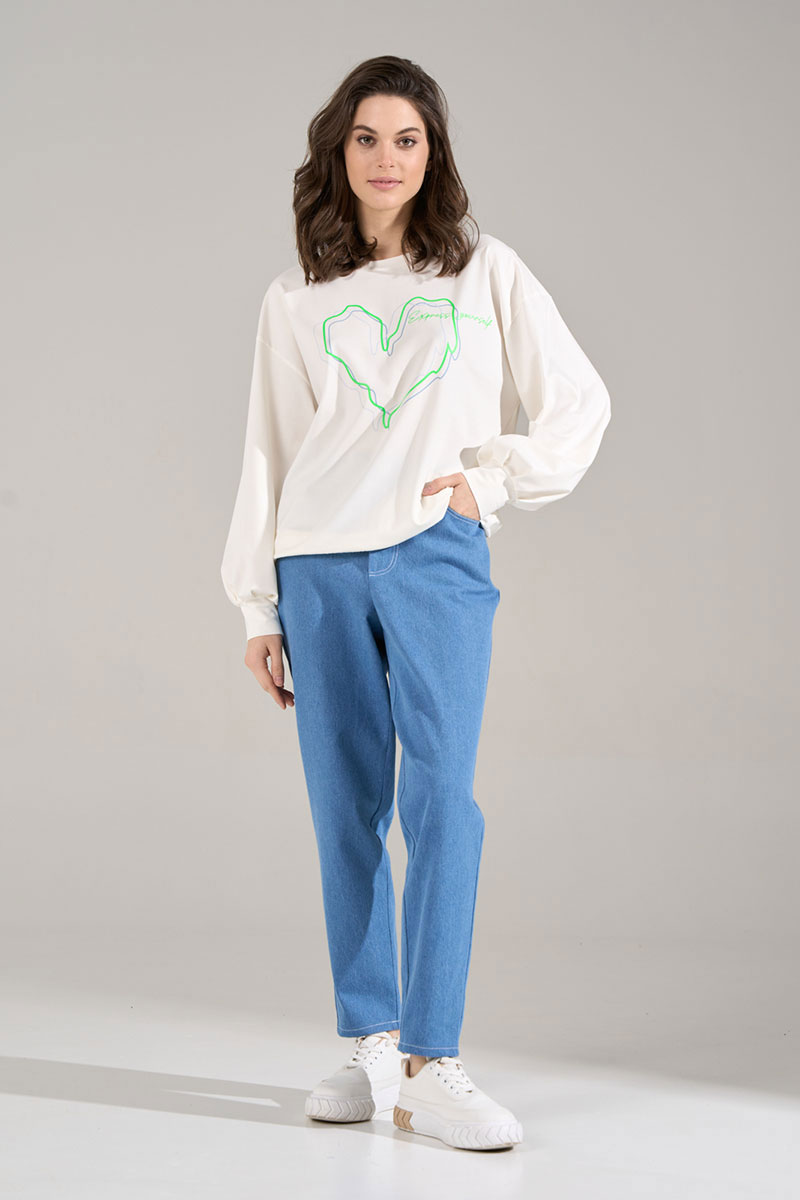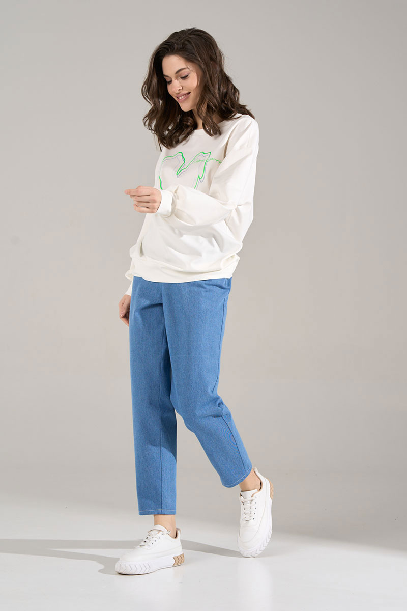 Брюки джинсовые с завышенной посадкой, свободного силуэта, слегка зауженные к низу, с отрезным поясом и накладными карманами на задних половинках.