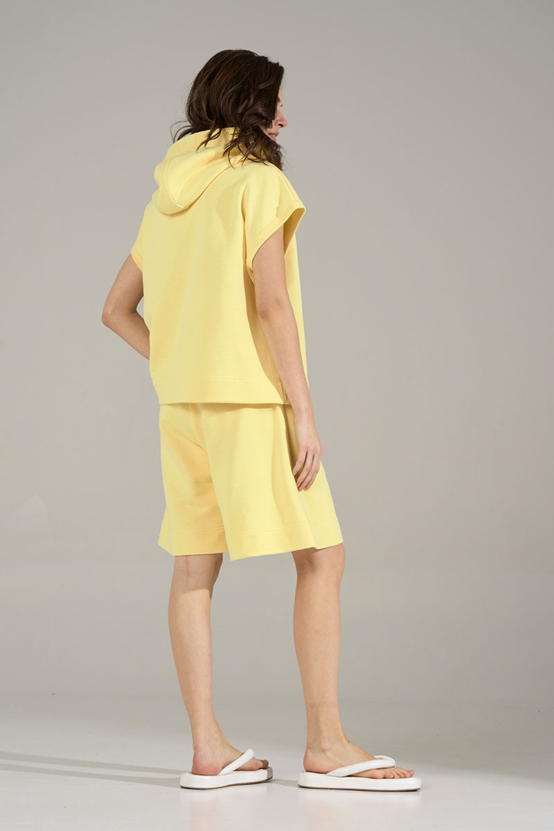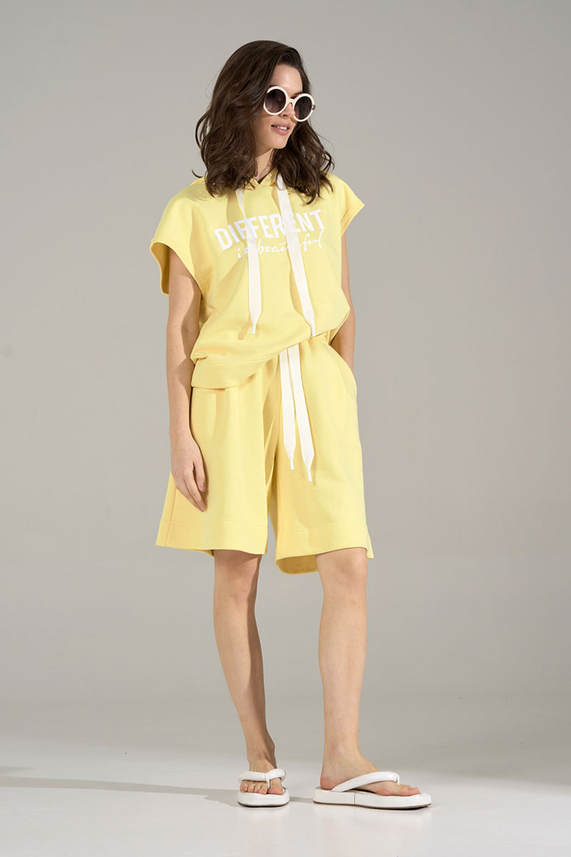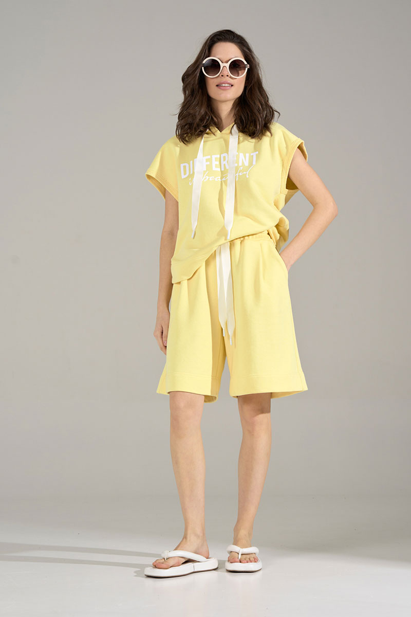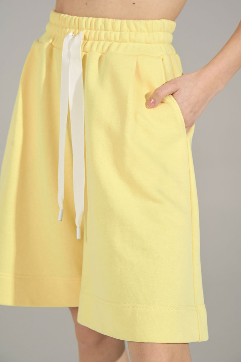 Шорты расширенные к низу, с отрезным широким поясом на резинке и шнуром из репсовой ленты.