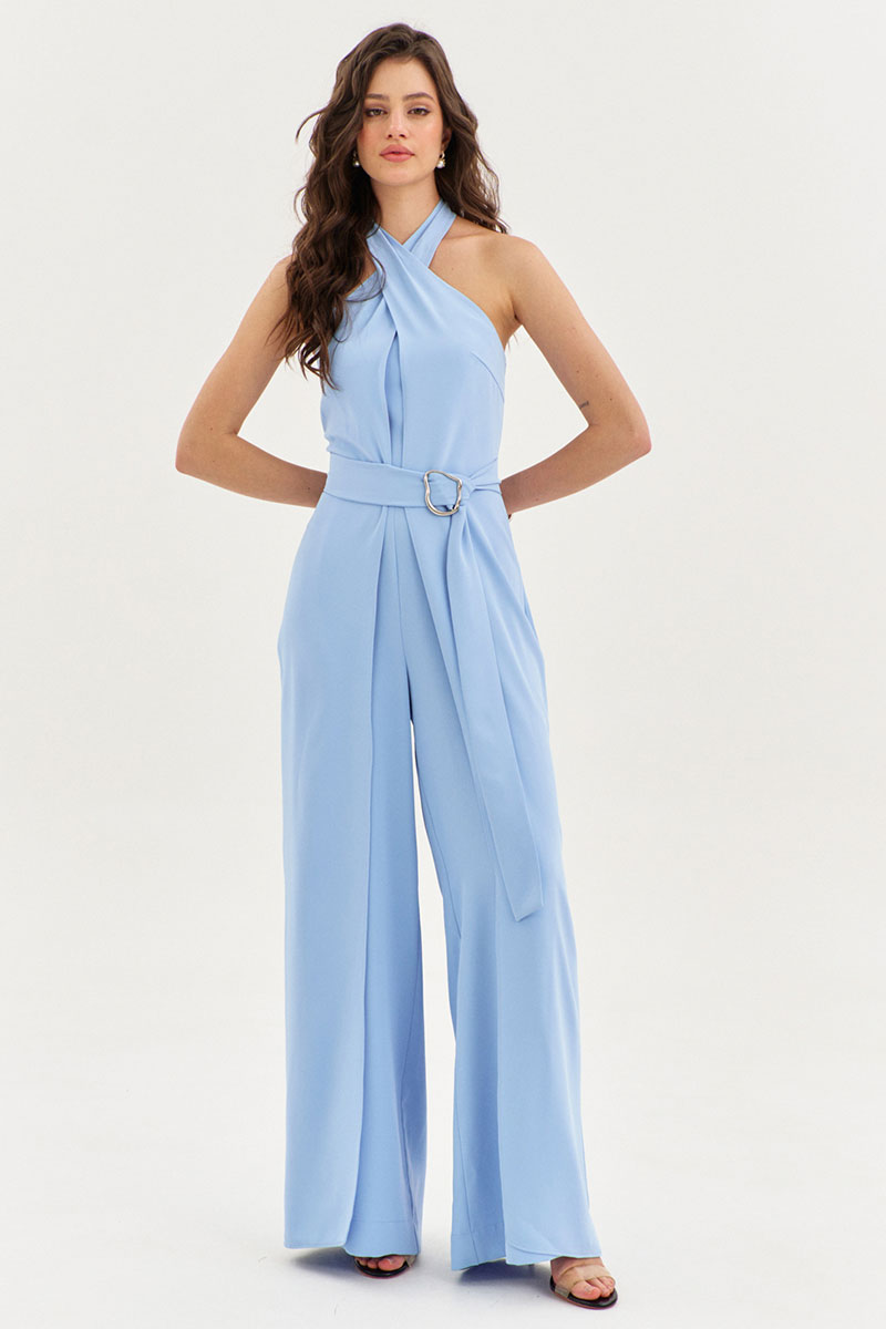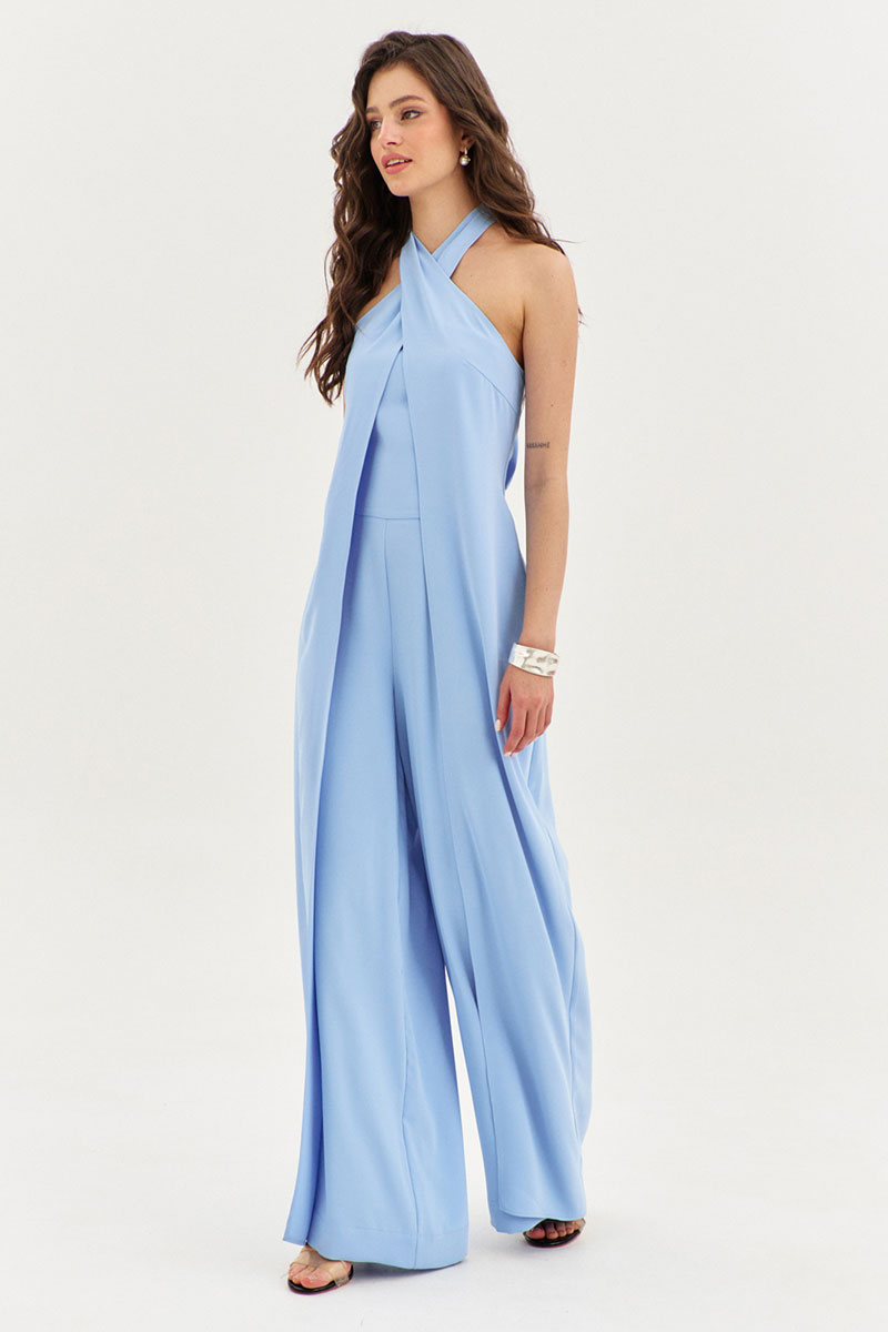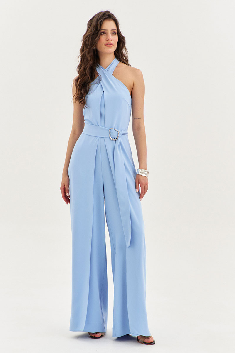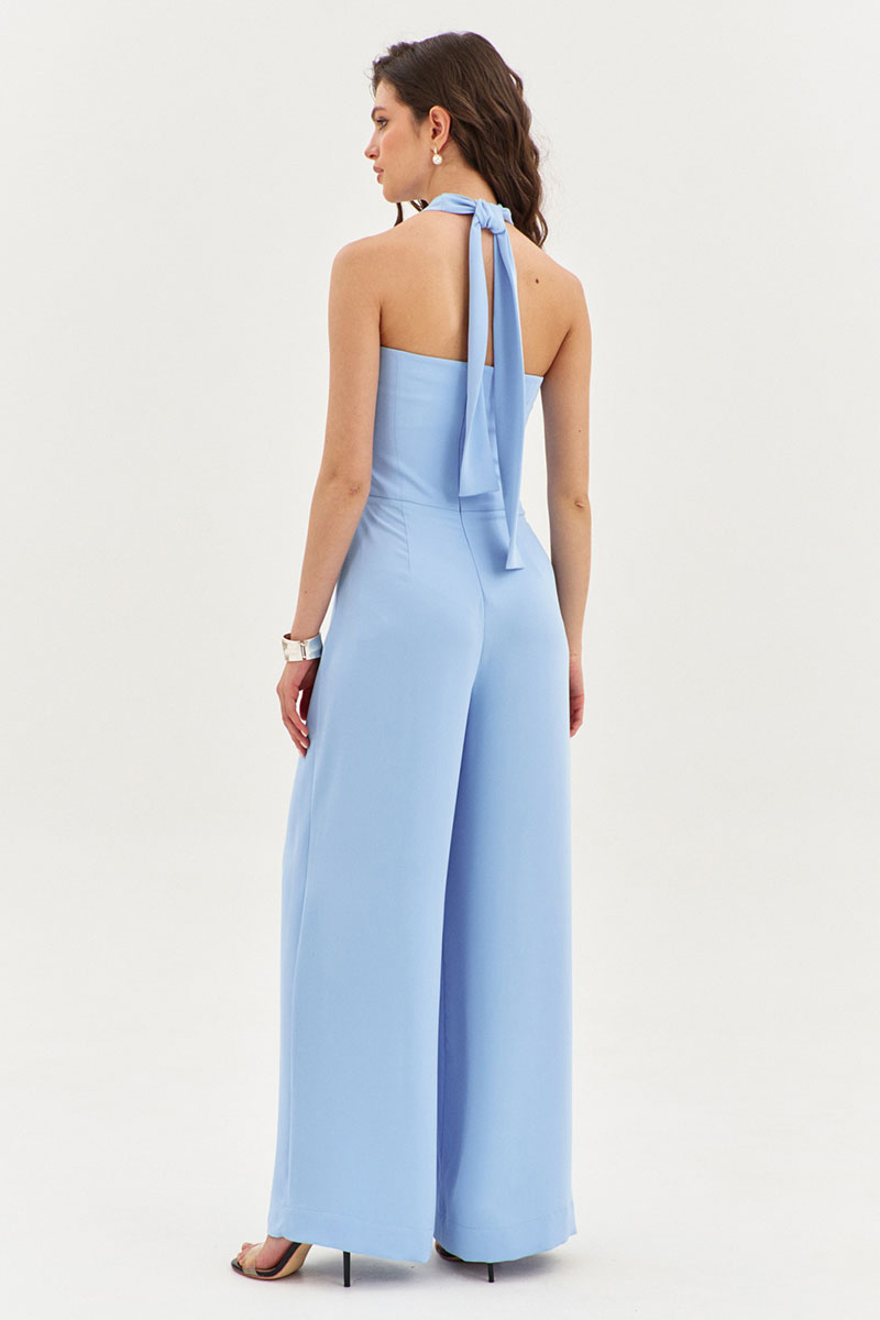 Комбинезон полуприлегающего силуэта. Комбинезон отрезной по линии талии. Лиф переда и спинки с рельефами. В среднем шве спинки вставлена потайная тесьма-«молния». Брюки длинные, широкие. По задним половинам брюк талиевые вытачки. По передним половинам односторонние складки. В боковые швы вставлены отлетные детали, которые переходят в завязки вокруг шей.