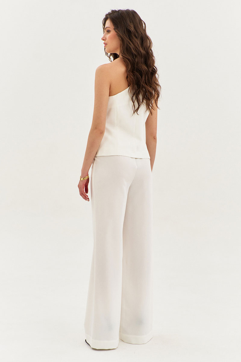 Жилетка полуприлегающего силуэта, выполнена на одно плечо, длиной чуть выше линии бедер. Спинка со средним швом и рельефами. По переду рельефы, обработаны карманы с листочкой и клапаном. Жилетка без воротника. Застежка по переду на петли и пуговицы. Жилетку дополняет съемная регулируемая бретель. Жилетка на подкладке.