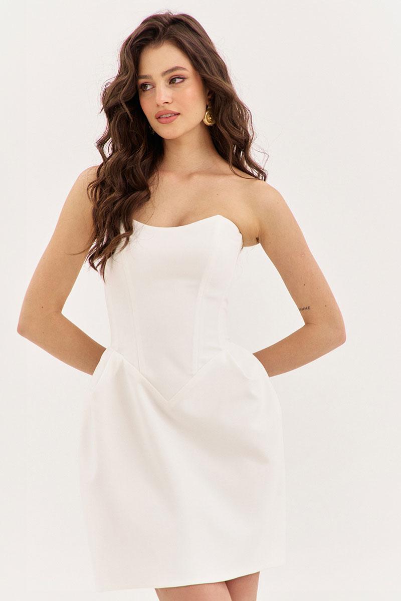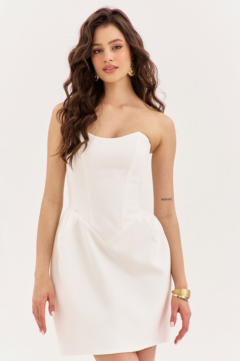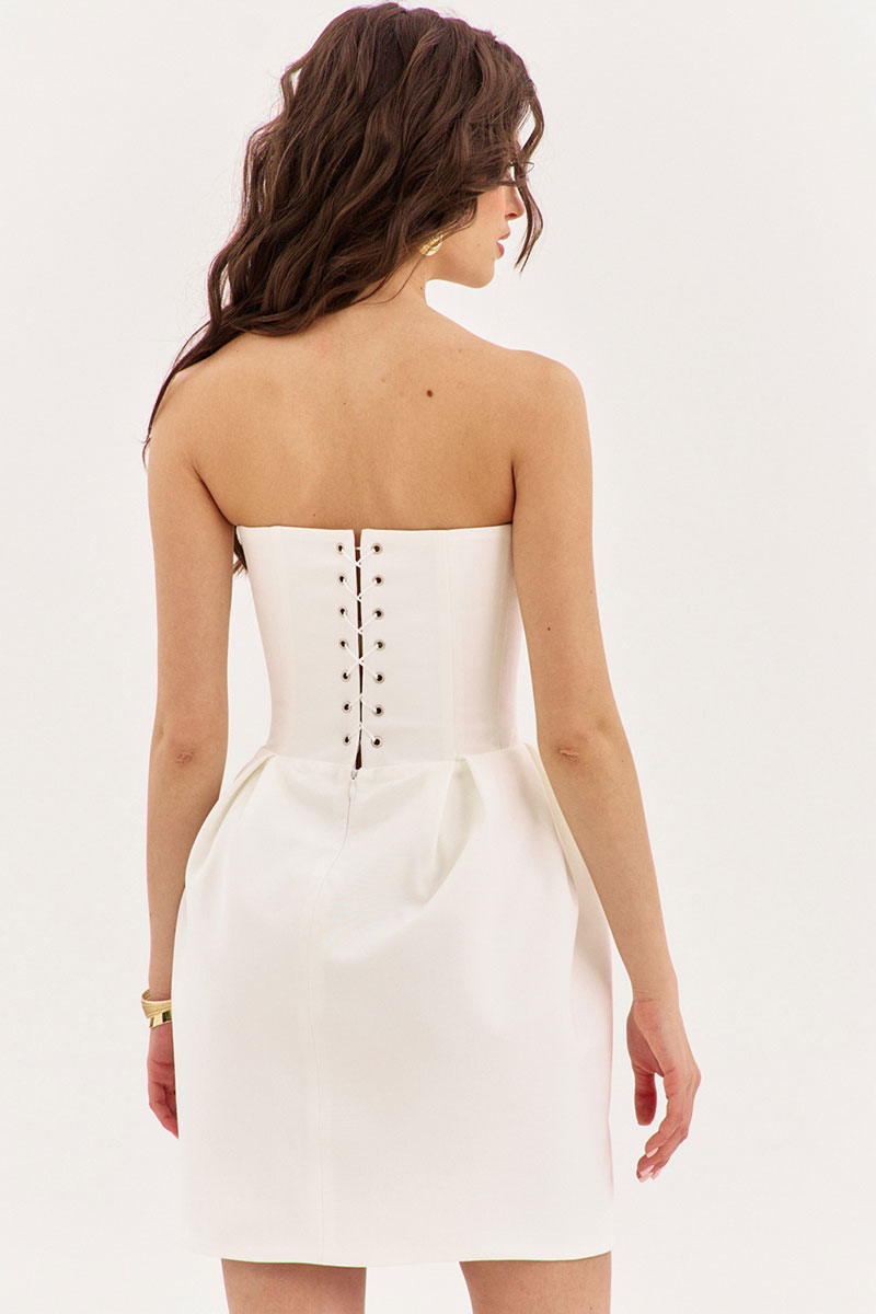 Платье прилегающего силуэта, длиной до середины бедра. Платье отрезное по линии талии. Лиф платья выполнен в виде корсета со шнуровкой по спинке. Юбка без бокового шва с мягкими складками от шва притачивания к корсету. За счет складок юбка имеет форму «тюльпана». Застежка на потайную тесьму-«молнию» в среднем шве спинки. Платье двойное, выполнено из основной ткани