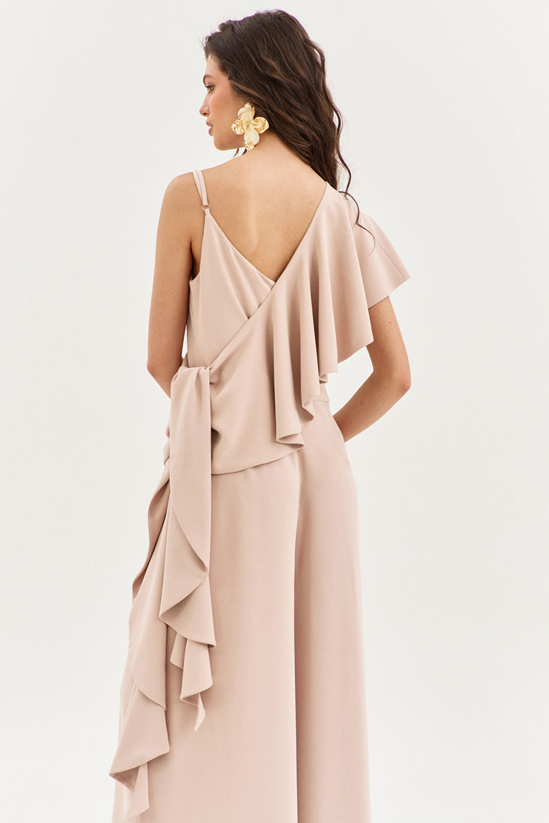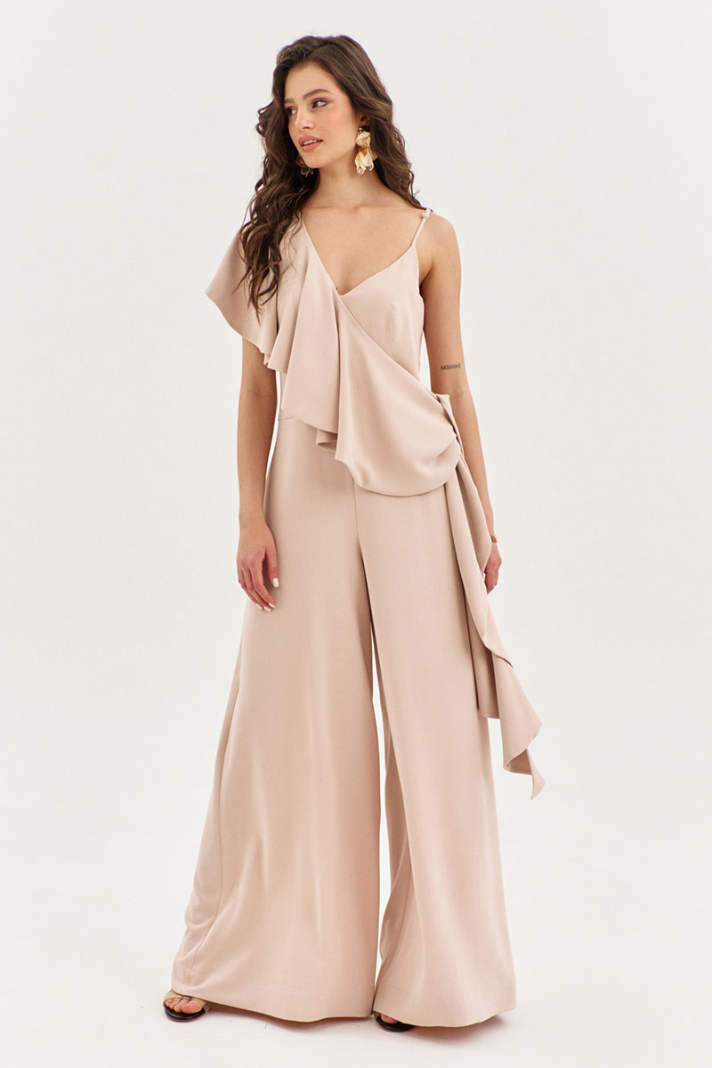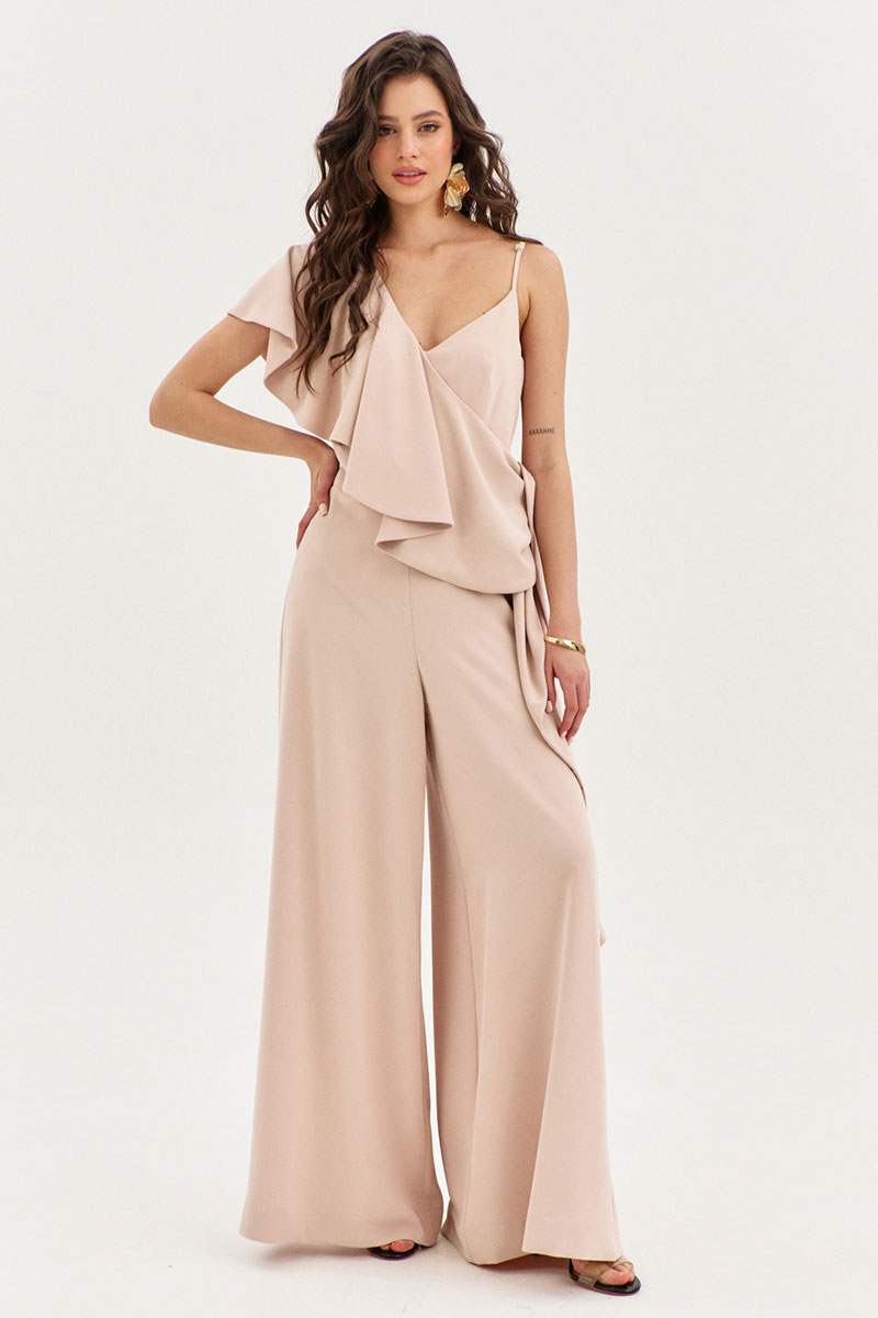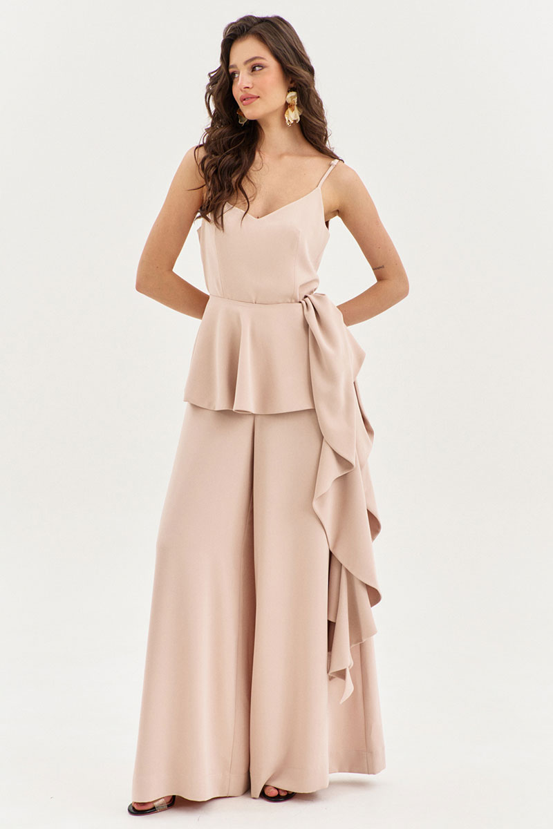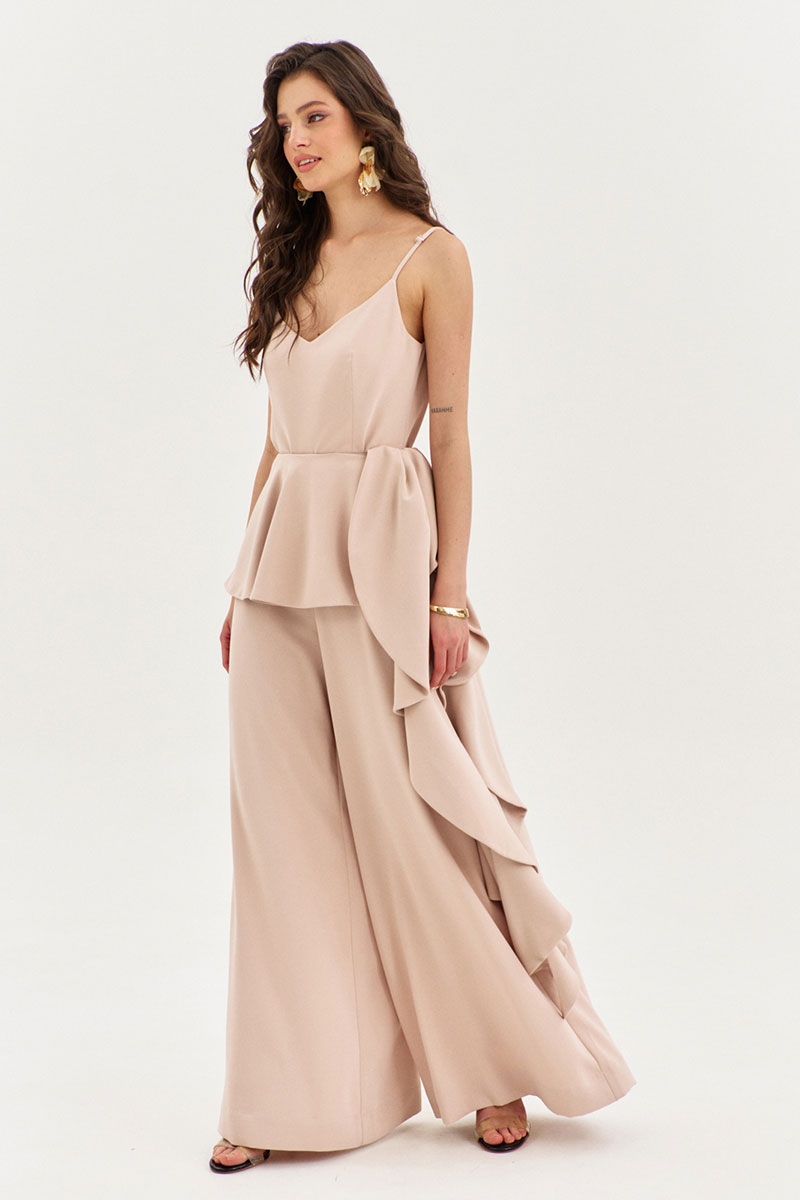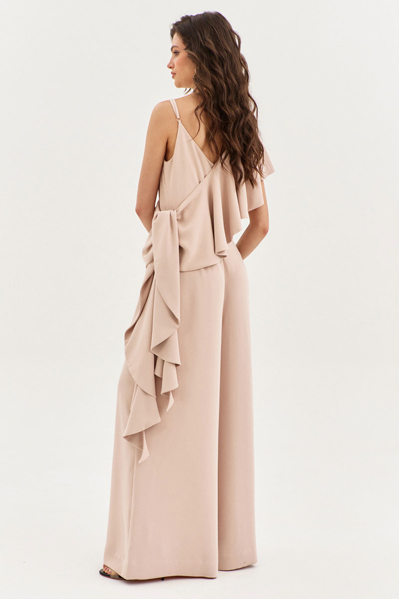 Комбинезон полуприлегающего силуэта. Комбинезон отрезной по линии талии. лиф спинки со средним швом, в котором обработана застежка на потайную тесьму-«молнию». Лиф переда с талиевыми вытачками. Брюки длинные, широкие. По задним половинам брюк талиевые вытачки. Комбинезон выполнен на регулируемых бретелях с фигурным вырезом горловины. Лиф комбинезона двойной из основной ткани. Комбинезон дополняет съемный волан.