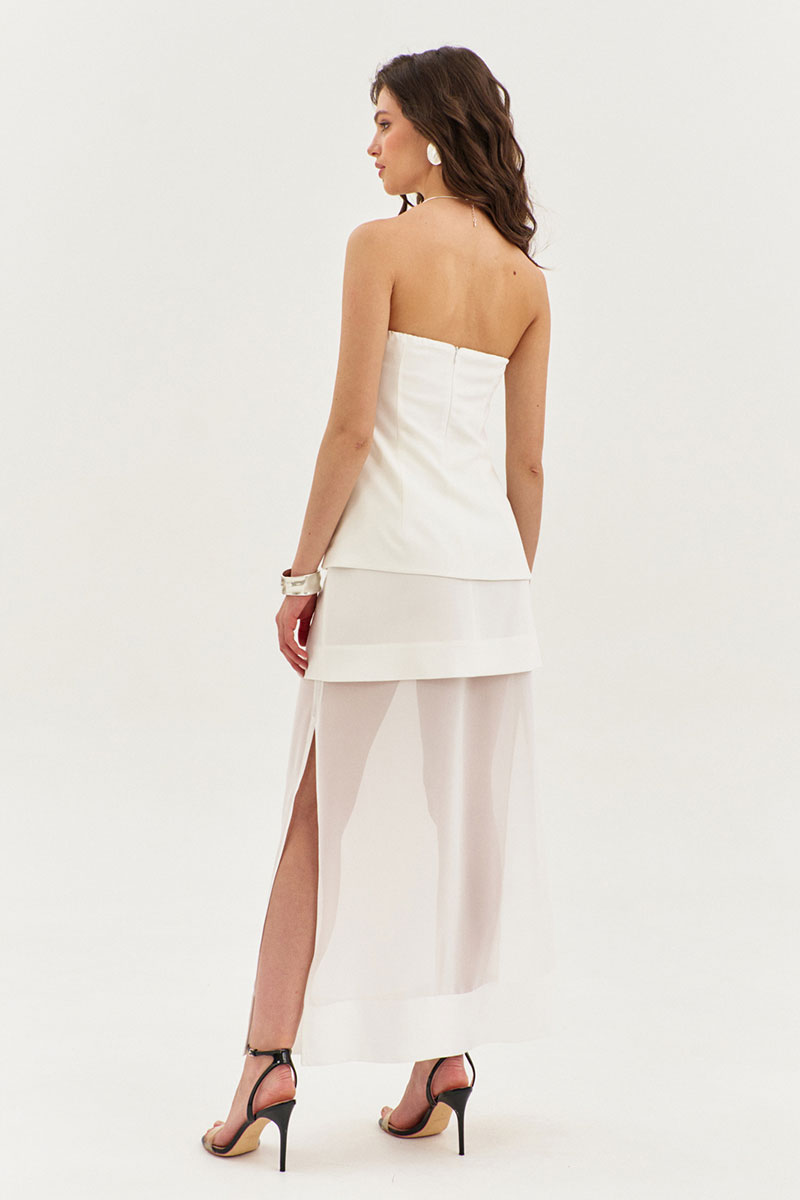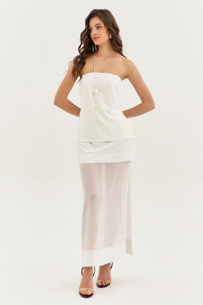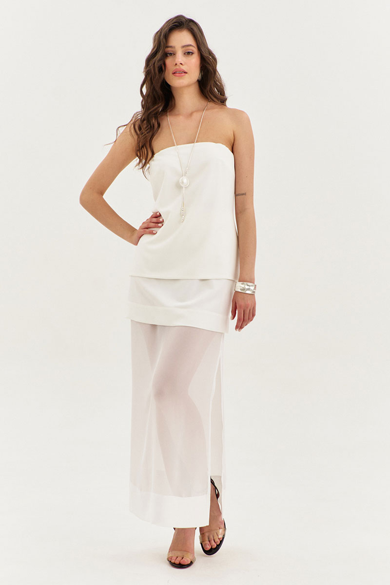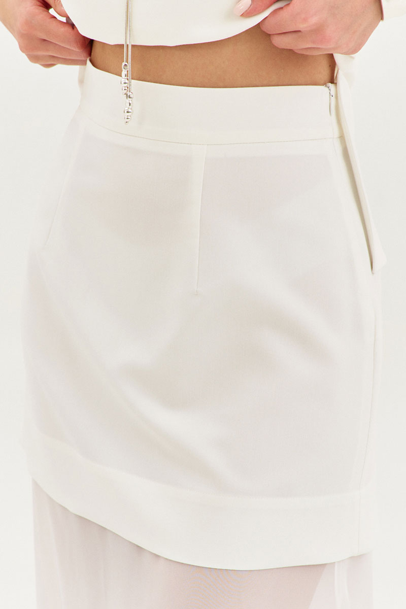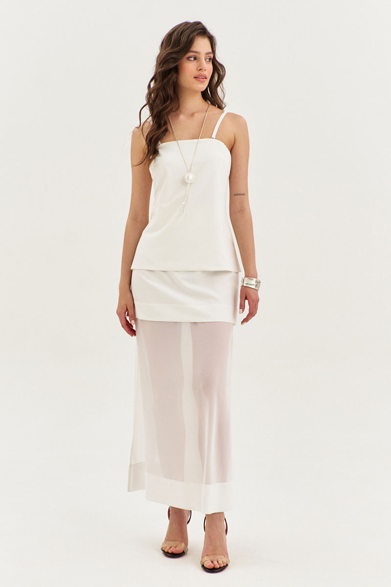 Юбка прямого силуэта, длиной до щиколотки, на притачном поясе. Юбка двойная: верхняя юбка выполнена из основной ткани, нижняя – из шифона. Верхняя юбка с талиевыми вытачками по заднему и переднему полотнищам. Нижняя юбка с высокими разрезами по боковым. В левом боковом шве обработана застежка на потайную тесьму-«молнию».