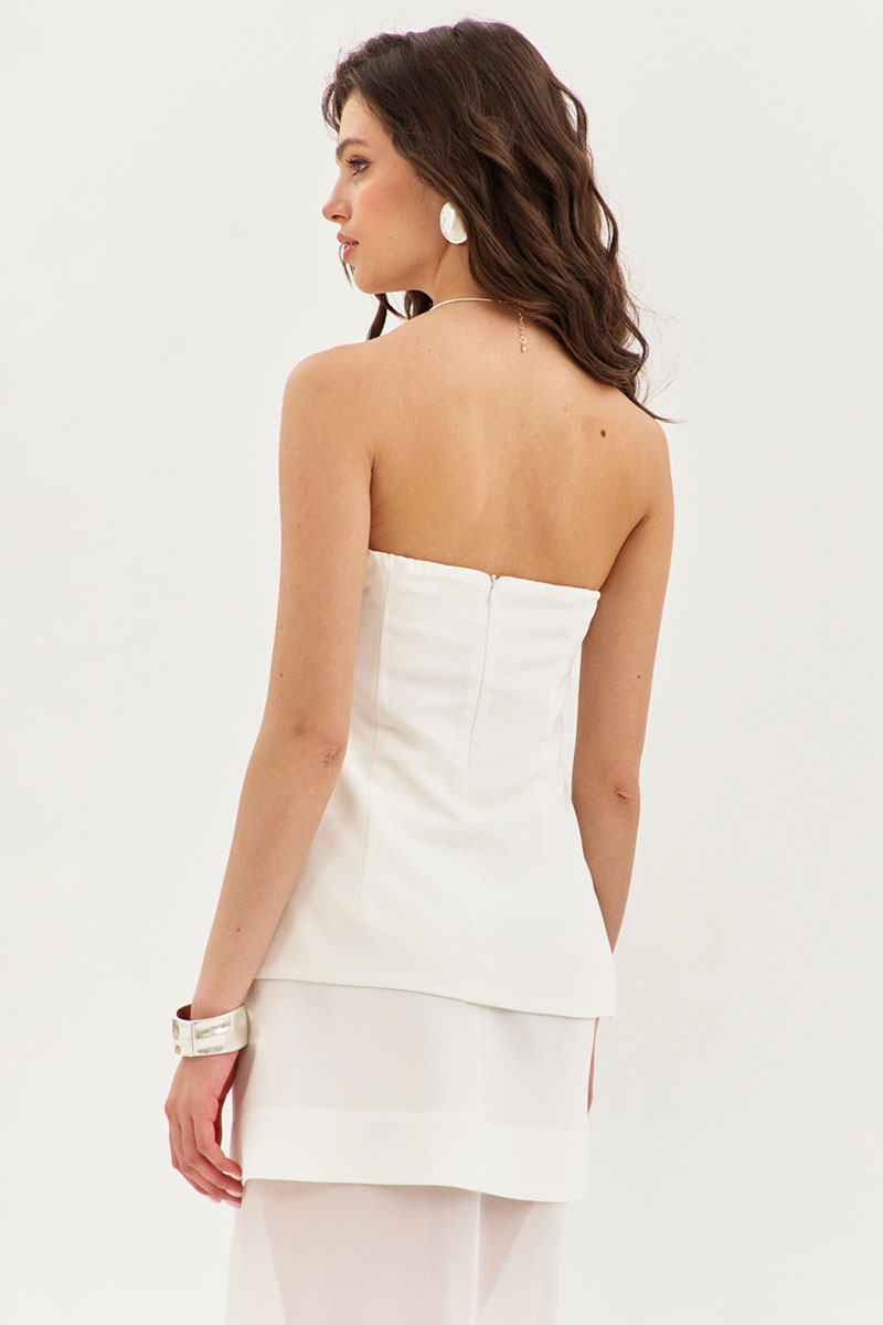 Блузка полуприлегающего силуэта, длиной выше линии бедер. Блузка выполнена на съемных регулируемых бретелях. Спинка с талиевыми вытачками и средним швом, в котором обработана застежка на потайную тесьму-«молнию». Перед с нагрудными вытачками. По верхнему шву переда и спинки частично вставлена резинка. В боковых швах обработаны разрезы. Блузка двойная из основной ткани.