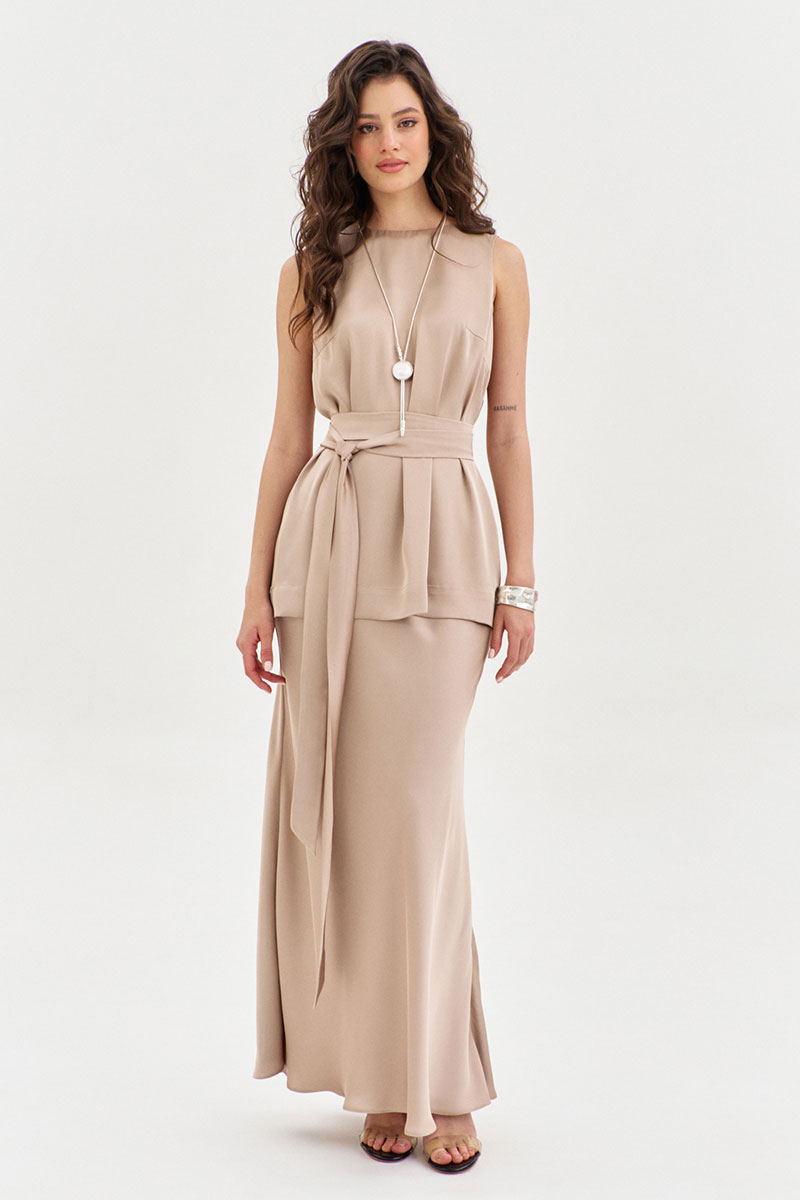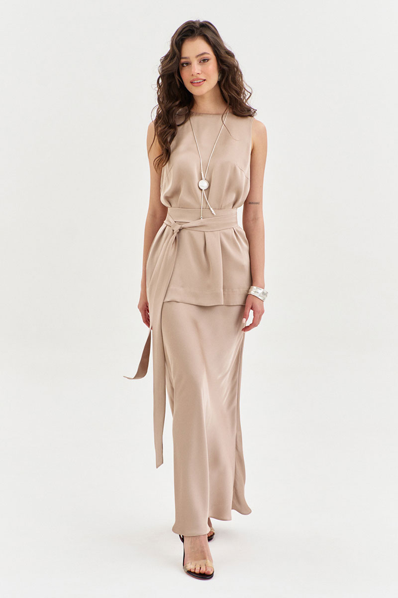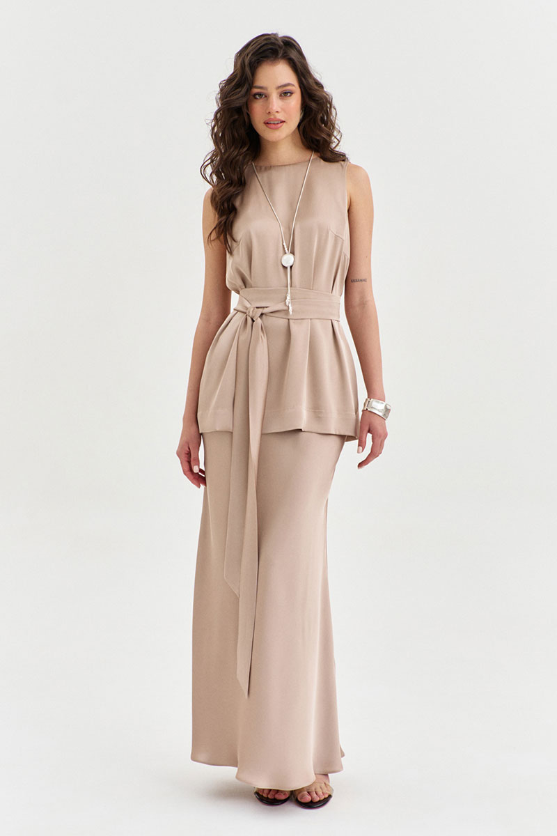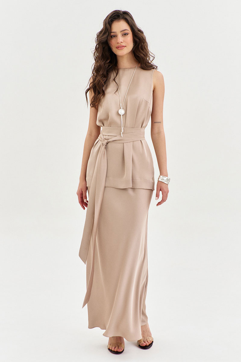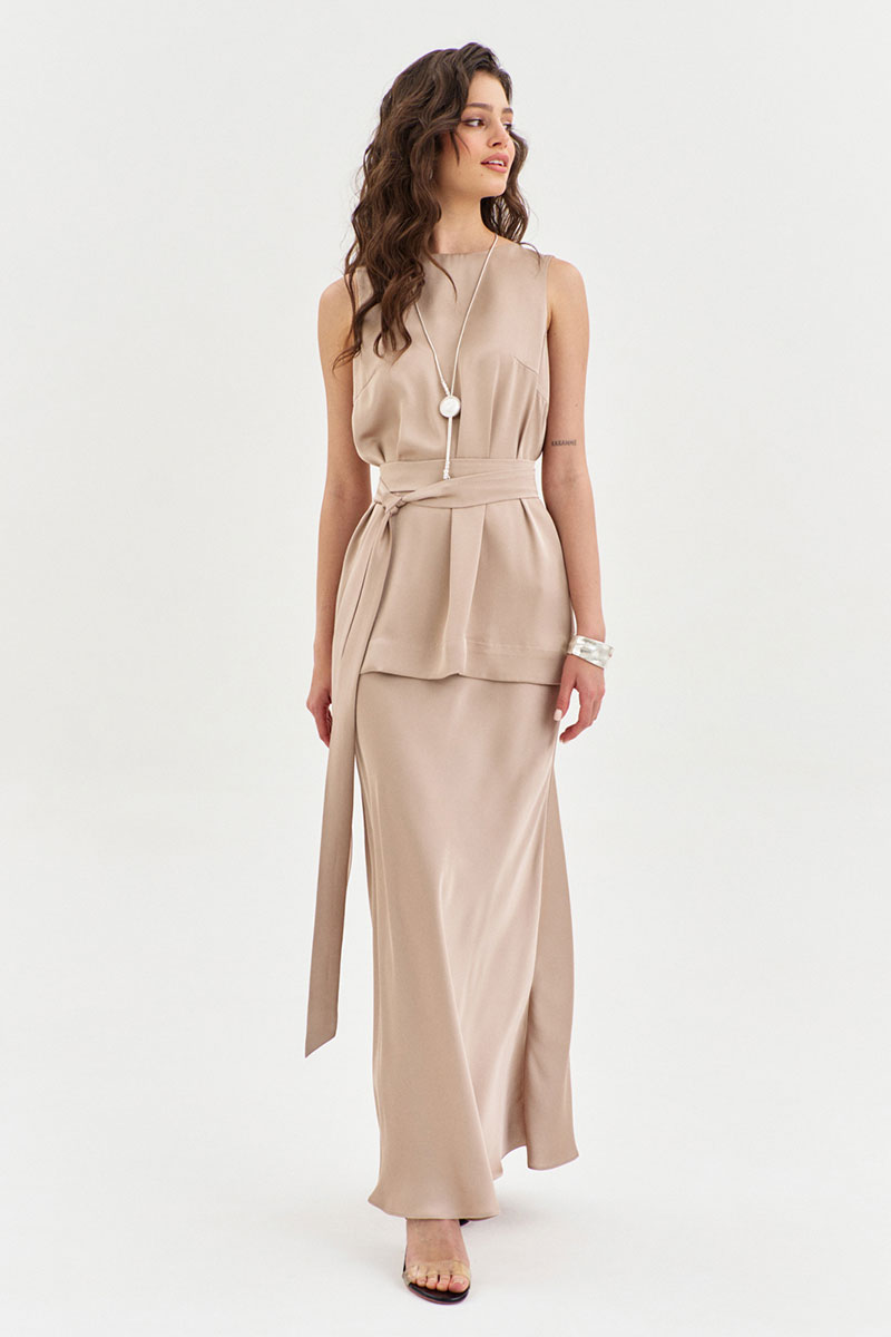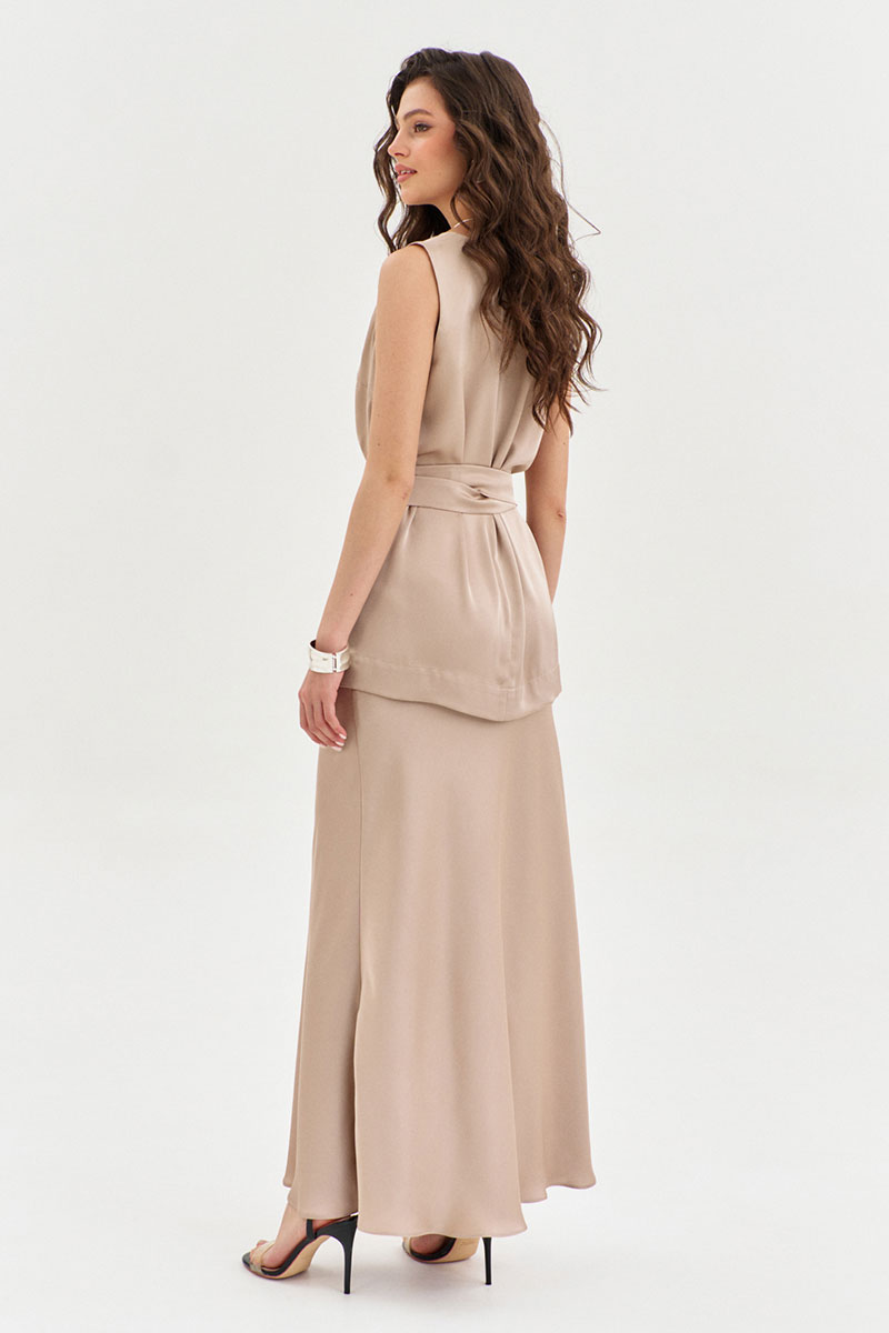 Блузка свободного кроя, длиной ниже линии бедер. Спинка со средним швом, в котором по горловине обработана застежка на навесную петлю и пуговицу. По переду нагрудные вытачки. Блузка без рукавов. Горловина округлой формы. блузку дополняет съемный пояс.