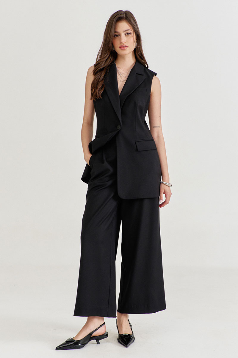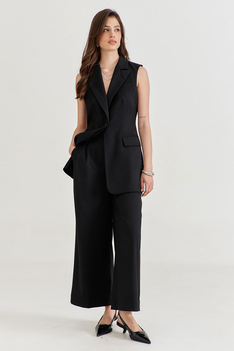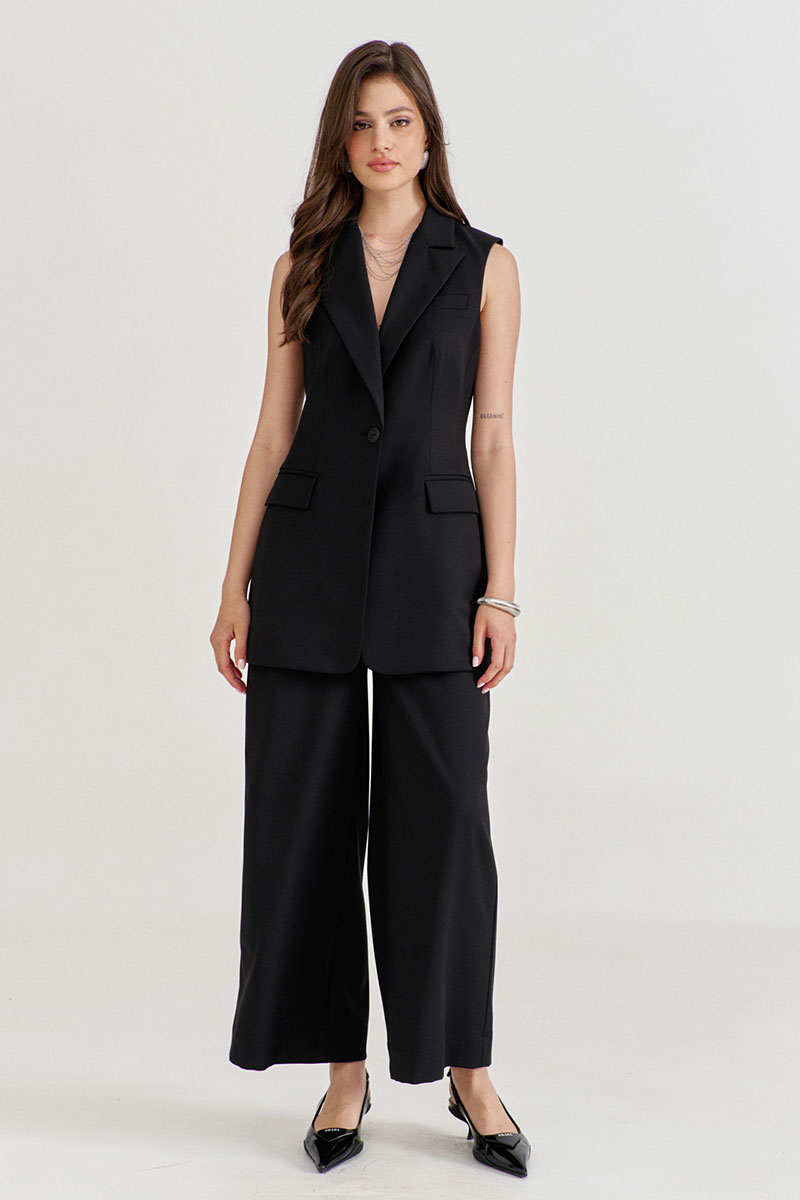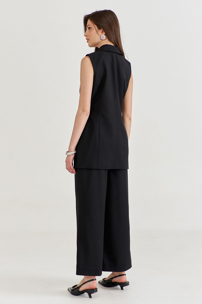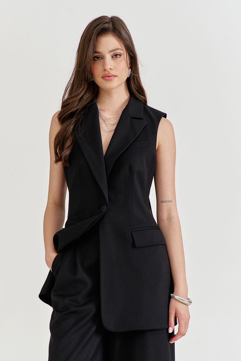 Жилетка полуприлегающего силуэта, длиной ниже линии бедер. Спинка со средним швом, с рельефами от пройм до низа. Перед с нагрудной вытачкой, рельефом и прорезным карманом с клапаном и обтачками. На левом переде, в области груди обработан карман-обманка с листочкой. Воротник пиджачного типа с лацканом. Застежка на петлю и пуговицу. Жилетка на подкладке.