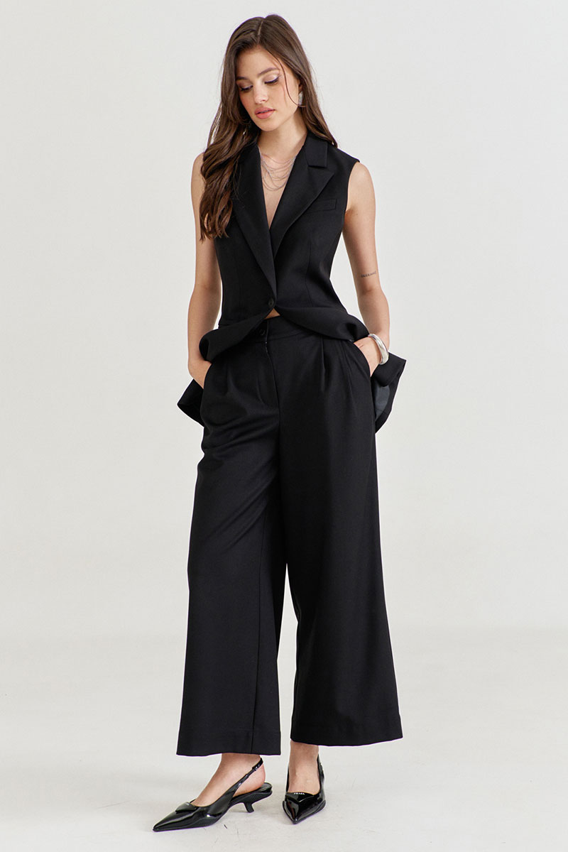 Брюки укороченные, длиной выше щиколотки, прямого силуэта, на притачном поясе с резинкой по спинке. По задним половинкам талиевые вытачки. По передним половинкам заложены односторонние складки, обработаны боковые карманы с наклонным входом, и застежка на тесьму-«молнию» с гульфиком и откоском. По поясу застежка на петлю и пуговицу. По поясу вставлены шлевки.