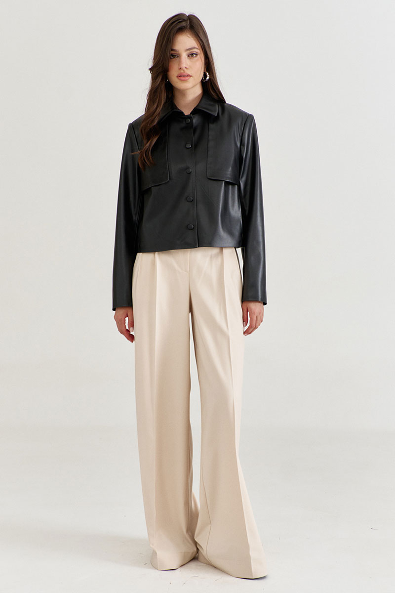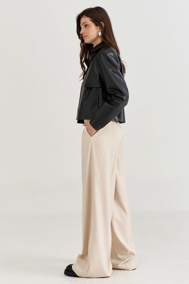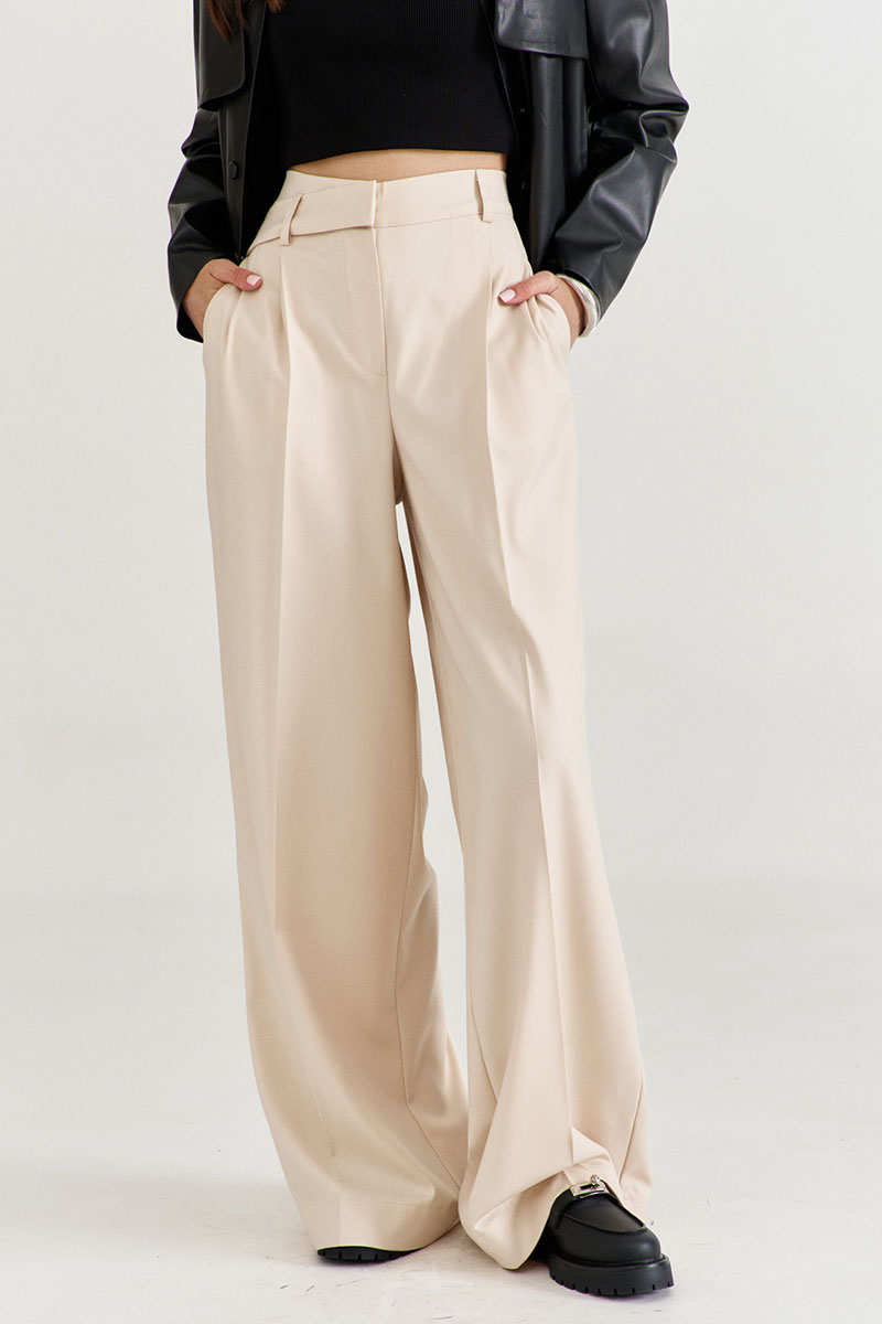 Брюки женские, длинные. По задним половинам талиевые вытачки и цельнокроеный пояс. По передним половинам односторонние складки частично застроченные, карманы фигурной формы. По задним и передним половинам заутюжены стрелки. В среднем шве обработана застежка на тесьму-«молнию». Верхний срез передних половин обработан притачным поясом. По спинке, между вытачками вставлена резинка.