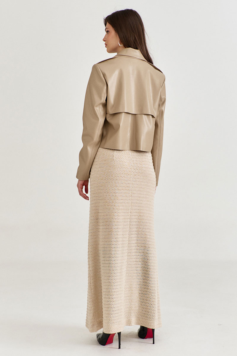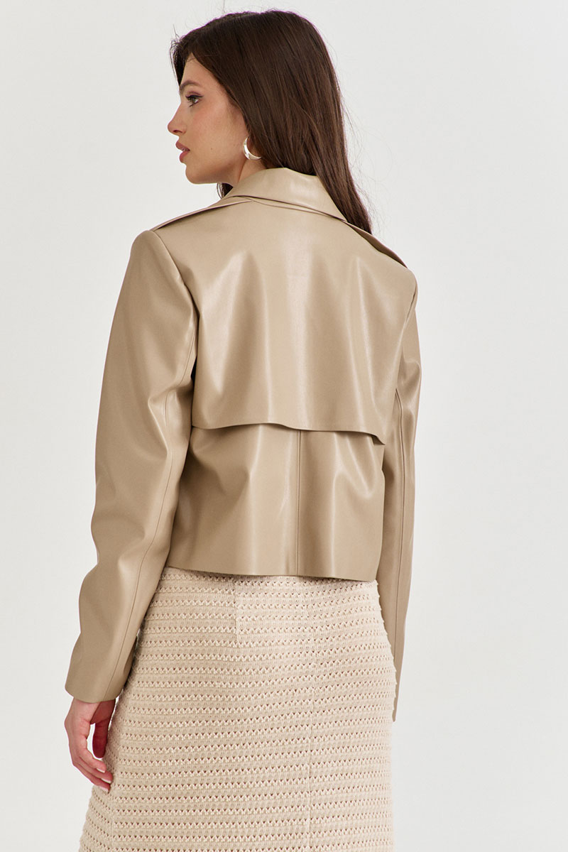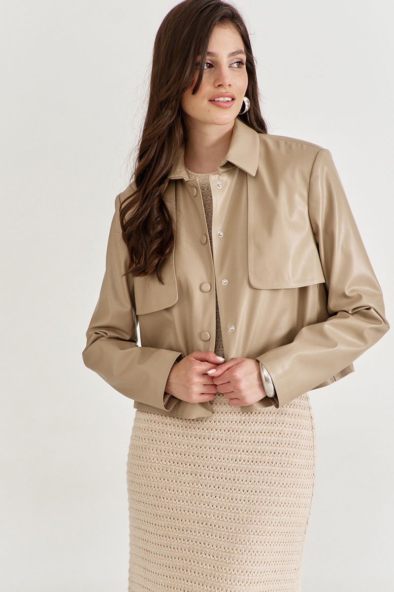 Куртка свободного кроя, длиной выше бедер. Спинка со средним швом и отлетной кокеткой. Перед с отлетной кокеткой и рельефом, в котором обработаны карманы. Рукава двушовные, втачные, длинные. По горловине воротник на отрезной стойке. Застежка по переду на кнопки. Куртка на подкладке и с плечевыми накладками