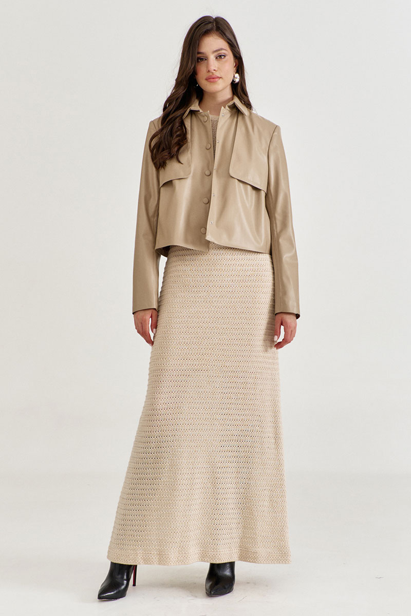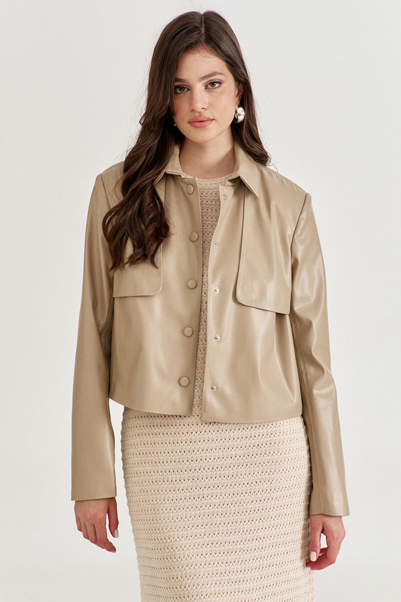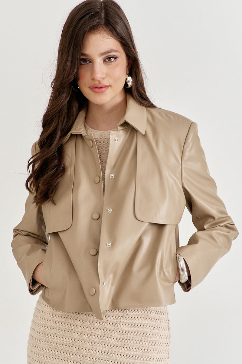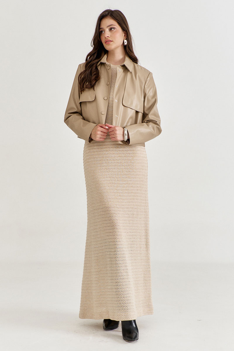 Куртка свободного кроя, длиной выше бедер. Спинка со средним швом и отлетной кокеткой. Перед с отлетной кокеткой и рельефом, в котором обработаны карманы. Рукава двушовные, втачные, длинные. По горловине воротник на отрезной стойке. Застежка по переду на кнопки. Куртка на подкладке и с плечевыми накладками