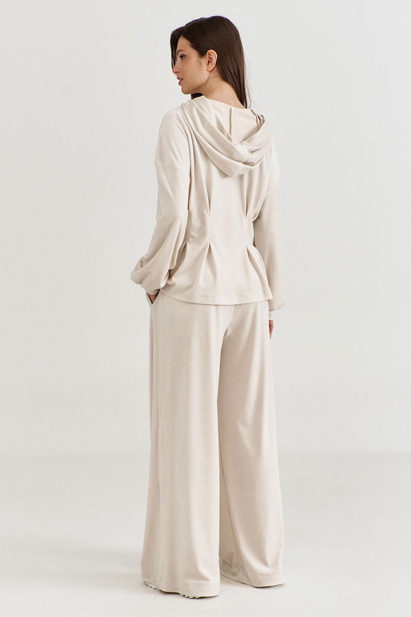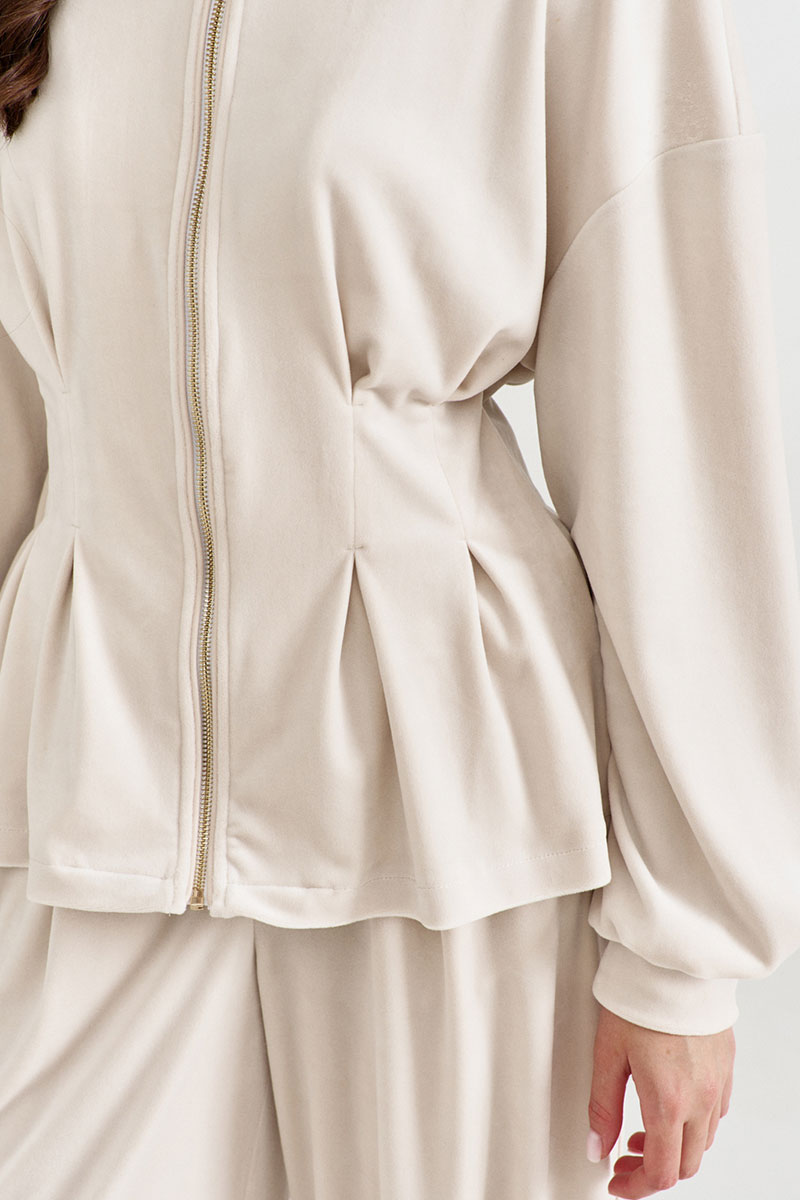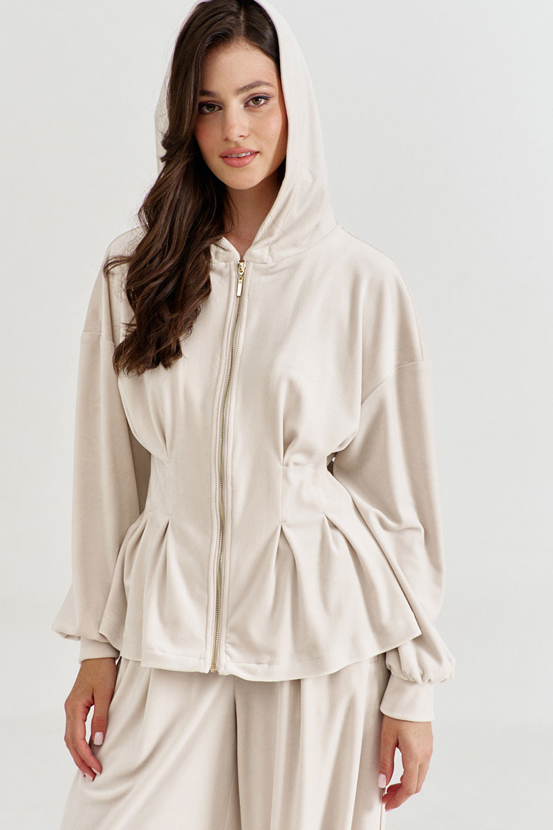 Джемпер полуприлегающего силуэта, длиной до бедер. Прилегание по талии достигнуто за счет встречных складок. Рукава одношовные, втачные, по низу с притачной манжетой. По горловине вставлен капюшон. По переду застежка на декоративную тесьму-«молнию». По молнии вставлен кант из контрастной ткани. Джемпер без подкладки.