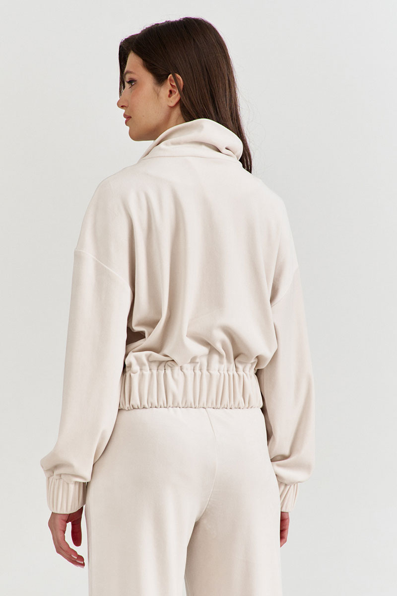 Бомбер, свободного кроя, длиной чуть ниже талии. По переду застежка на декоративную тесьму-«молнию». По горловине воротник стойка. Линия плеча спущена. Рукава длинные, по низу с притачной манжетой, в которую вставлена резинка. По низу бомбера вставлена резинка.
