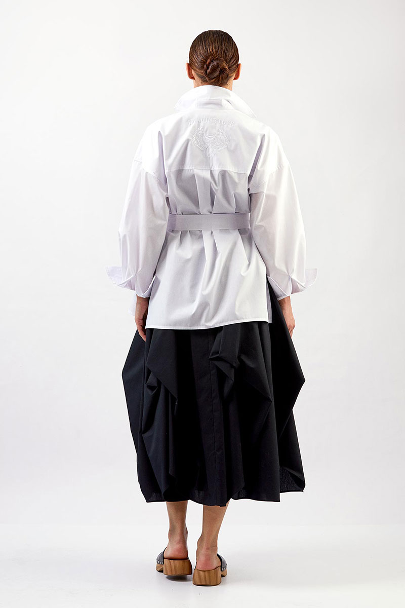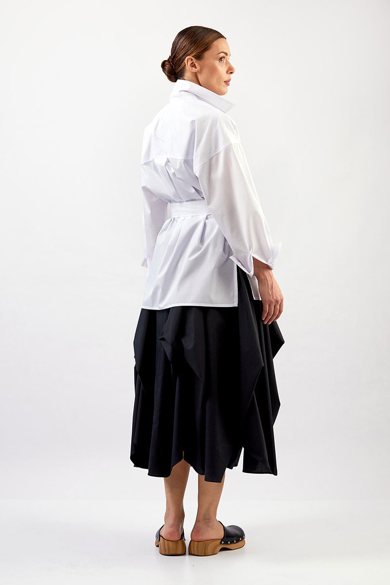 - на спинке переходящая на перед кокетка с вышивкой; от кокетки вниз — бантовая складка