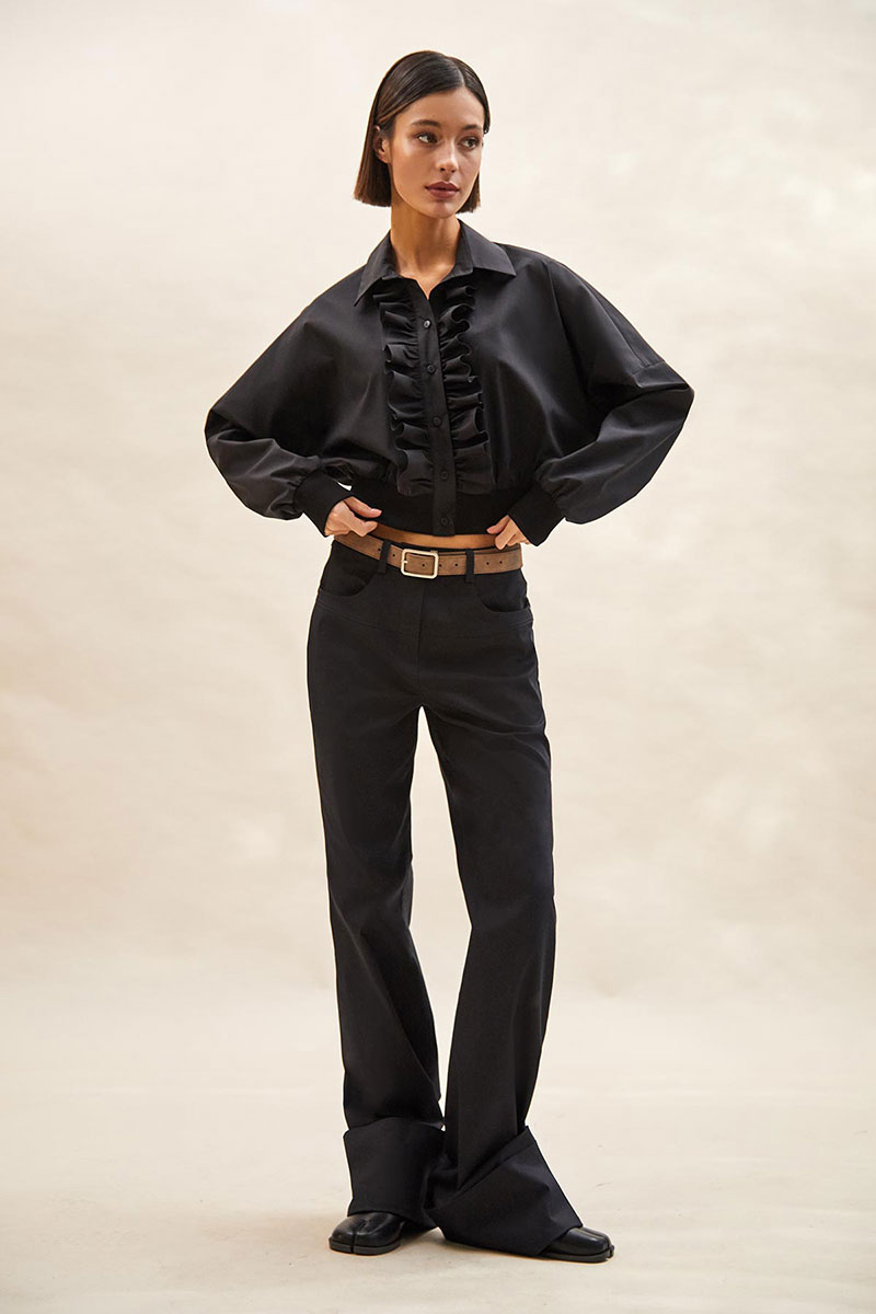 - застежка на планку с пуговицами и двумя оборками вдоль планки;