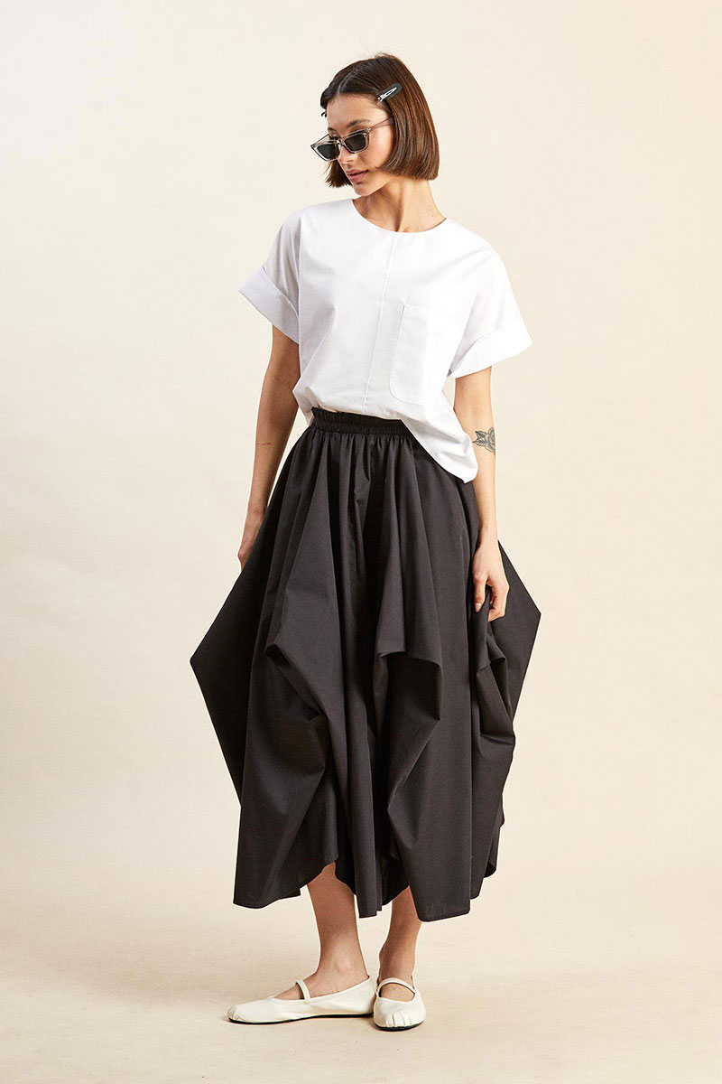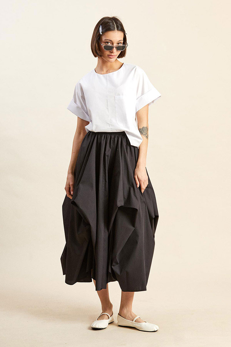 - линия плеча спущенная, проймы закрыты широкими манжетами с отворотами, разрезами по шву, со скругленными уголками;