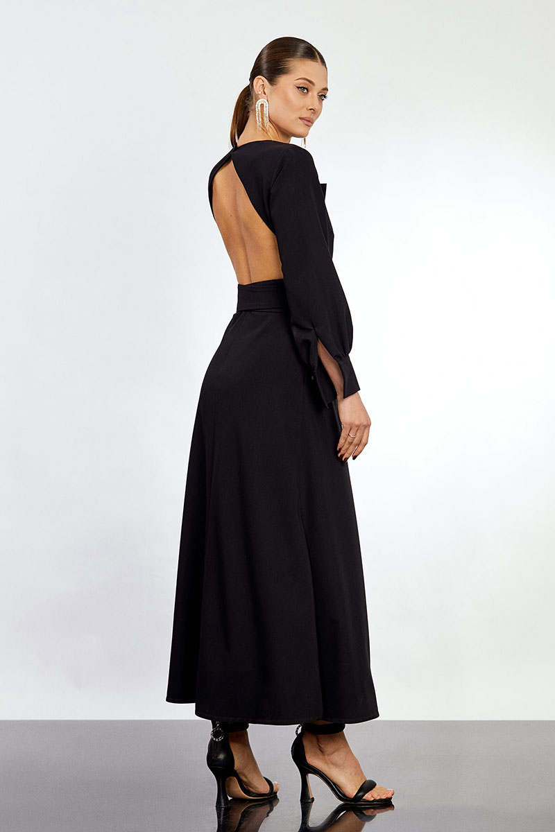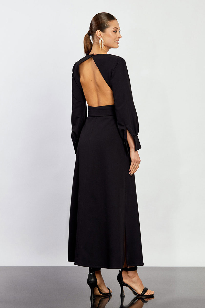 - открытая спина с застежкой на молнию в среднем шве и петлю, пуговицу у горловины