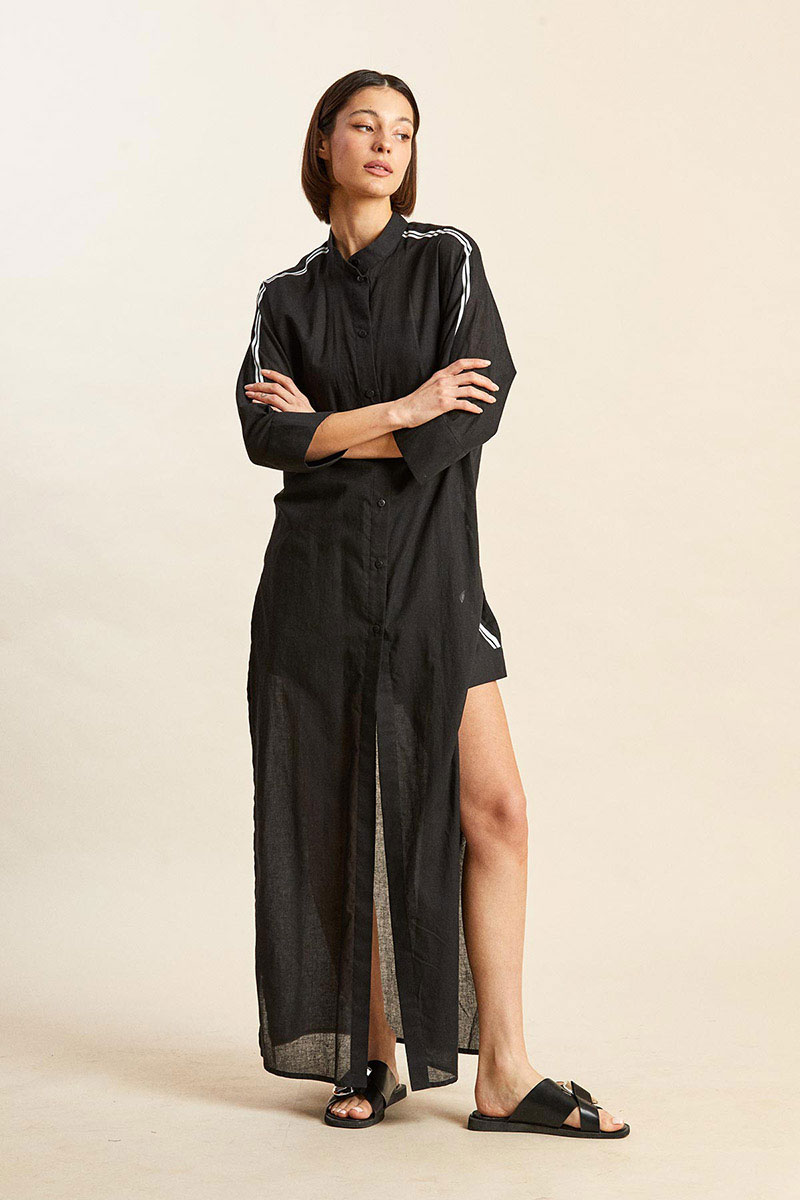 - воротник-стойка со скругленными концами и застежкой на пуговицу;